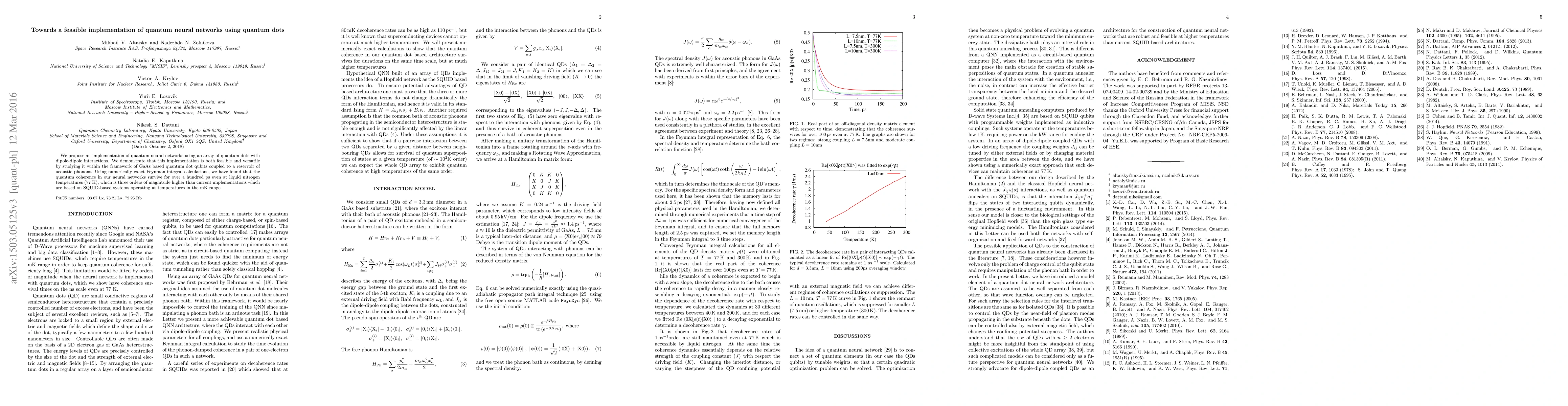 The main technical contribution of this work is the demonstration of a quantum neural network implementation using quantum dots that maintains coherence at relatively higher temperatures (77 K) compared to existing SQUID-based systems (mK range), using numerically exact Feynman integral calculations.