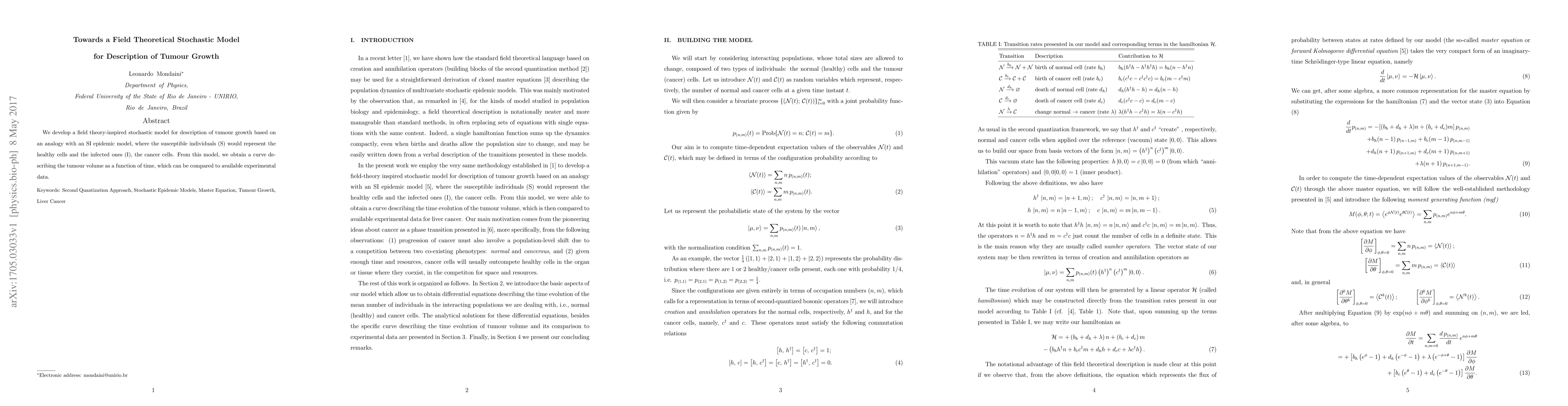 We develop a field theory-inspired stochastic model for description of tumour growth based on an analogy with an SI epidemic model, where the susceptible individuals (S) would represent the healthy cells and the infected ones (I), the cancer cells. From this model, we obtain a curve describing the tumour volume as a function of time, which can be compared to available experimental data.