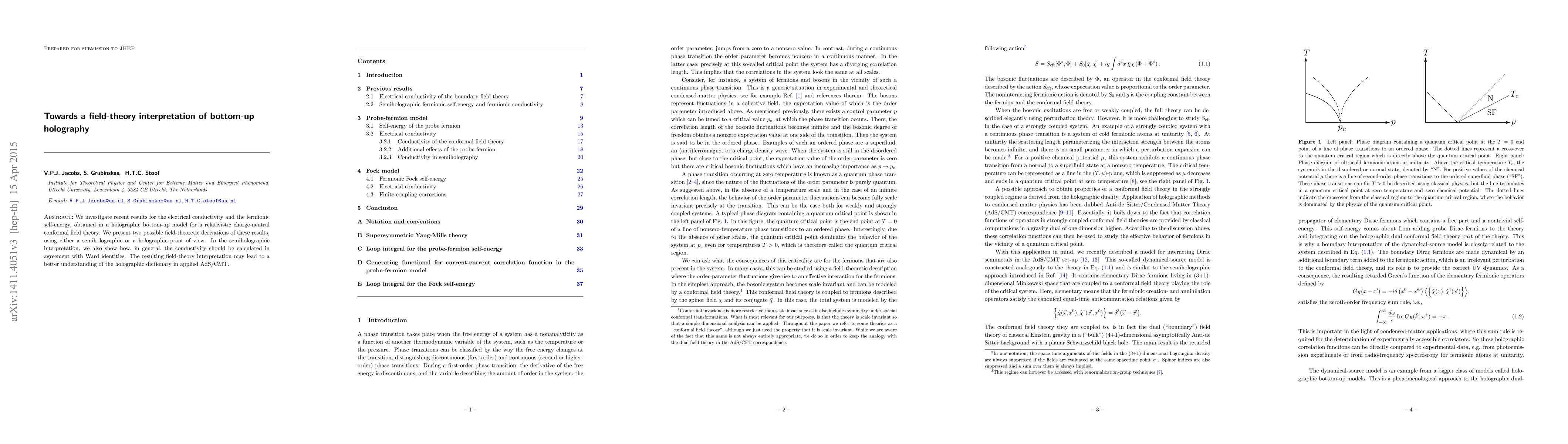 We investigate recent results for the electrical conductivity and the fermionic self-energy, obtained in a holographic bottom-up model for a relativistic charge-neutral conformal field theory. We present two possible field-theoretic derivations of these results, using either a semiholographic or a holographic point of view. In the semiholographic interpretation, we also show how, in general, the conductivity should be calculated in agreement with Ward identities. The resulting field-theory interpretation may lead to a better understanding of the holographic dictionary in applied AdS/CMT.