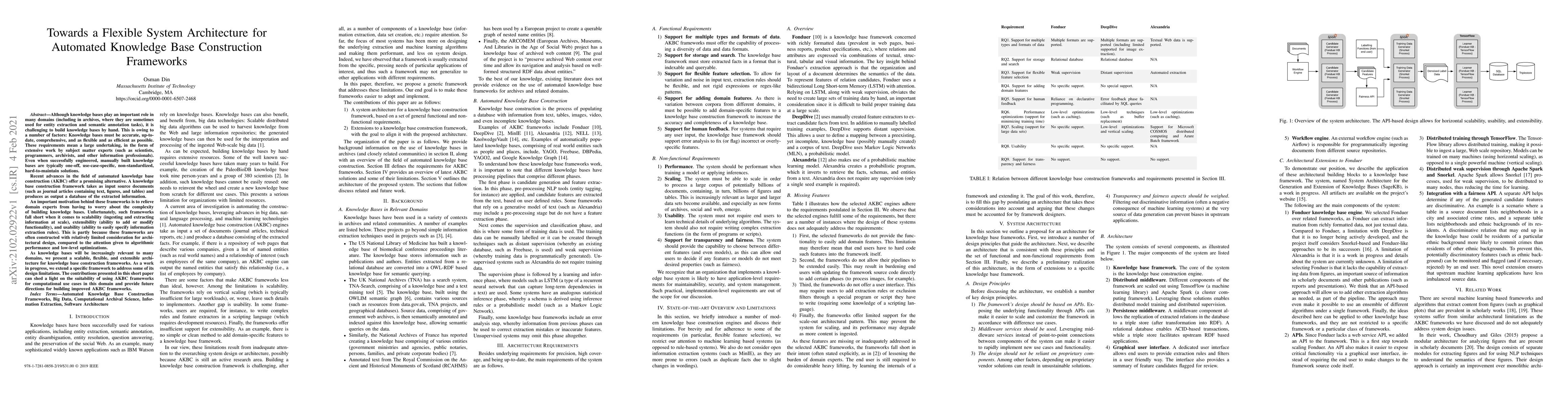 Although knowledge bases play an important role in many domains (including in archives, where they are sometimes used for entity extraction and semantic annotation tasks), it is challenging to build knowledge bases by hand. This is owing to a number of factors: Knowledge bases must be accurate, up-to-date, comprehensive, and as flexible and as efficient as possible. These requirements mean a large undertaking, in the form of extensive work by subject matter experts (such as scientists, programmers, archivists, and other information professionals). Even when successfully engineered, manually built knowledge bases are typically one-off, use-case-specific, non-standardized, hard-to-maintain solutions. We present a scalable, flexible, and extensible architecture for knowledge base construction frameworks. As a work in progress, we extend a specific framework to address some of its design limitations. The contributions presented in this short paper can shed a light on the suitability of using AKBC frameworks for computational use cases in this domain and provide future directions for building improved AKBC frameworks.