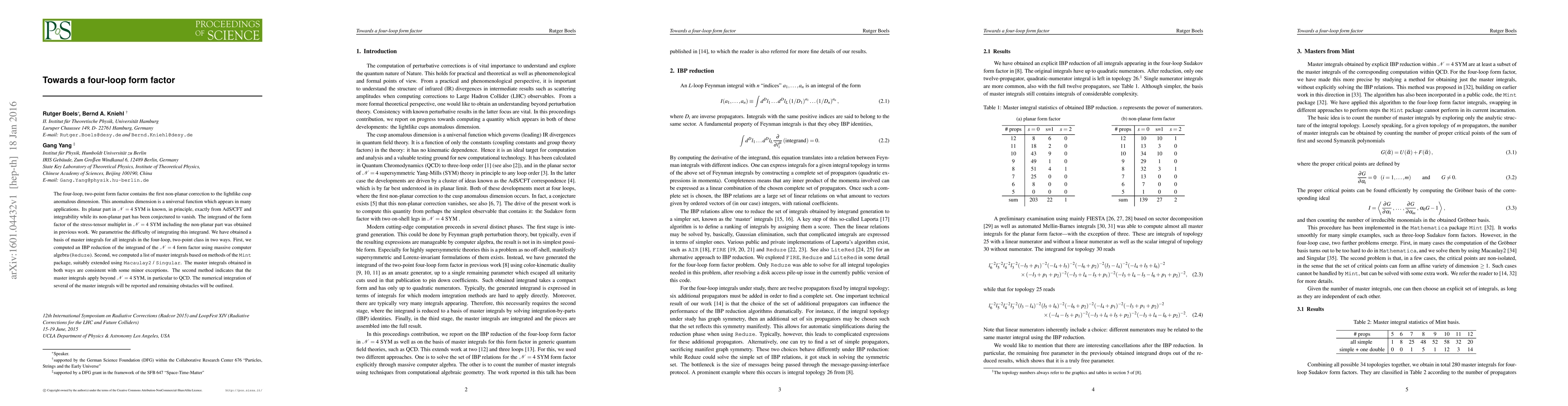 The four-loop, two-point form factor contains the first non-planar correction to the lightlike cusp anomalous dimension. This anomalous dimension is a universal function which appears in many applications. Its planar part in N = 4 SYM is known, in principle, exactly from AdS/CFT and integrability while its non-planar part has been conjectured to vanish. The integrand of the form factor of the stress-tensor multiplet in N = 4 SYM including the non-planar part was obtained in previous work. We parametrise the difficulty of integrating this integrand. We have obtained a basis of master integrals for all integrals in the four-loop, two-point class in two ways. First, we computed an IBP reduction of the integrand of the N = 4 form factor using massive computer algebra (Reduze). Second, we computed a list of master integrals based on methods of the Mint package, suitably extended using Macaulay2 / Singular. The master integrals obtained in both ways are consistent with some minor exceptions. The second method indicates that the master integrals apply beyond N = 4 SYM, in particular to QCD. The numerical integration of several of the master integrals will be reported and remaining obstacles will be outlined