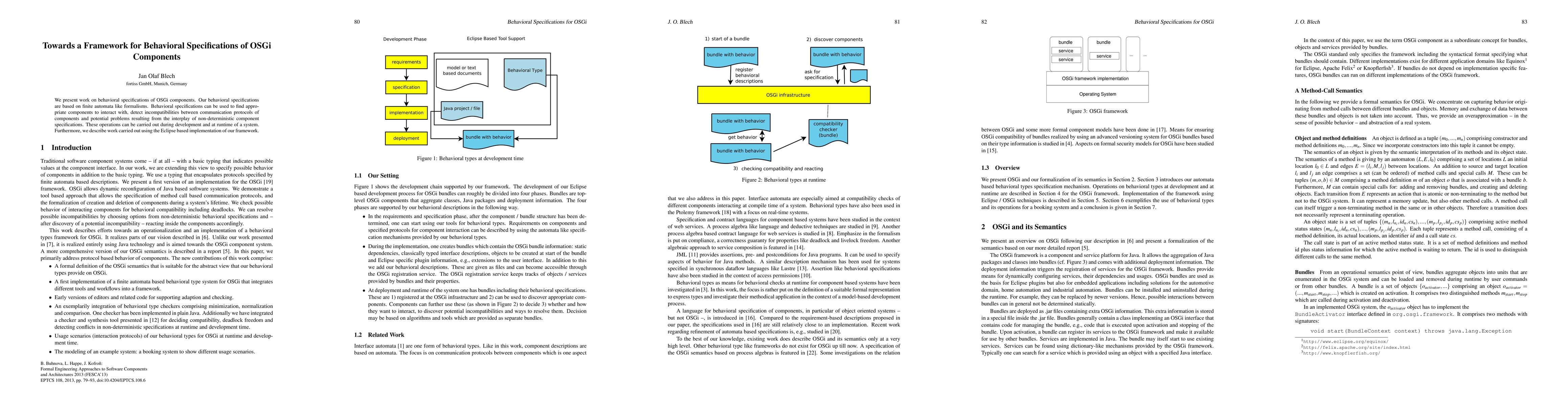 We present work on behavioral specifications of OSGi components. Our behavioral specifications are based on finite automata like formalisms. Behavioral specifications can be used to find appropriate components to interact with, detect incompatibilities between communication protocols of components and potential problems resulting from the interplay of non-deterministic component specifications. These operations can be carried out during development and at runtime of a system. Furthermore, we describe work carried out using the Eclipse based implementation of our framework.