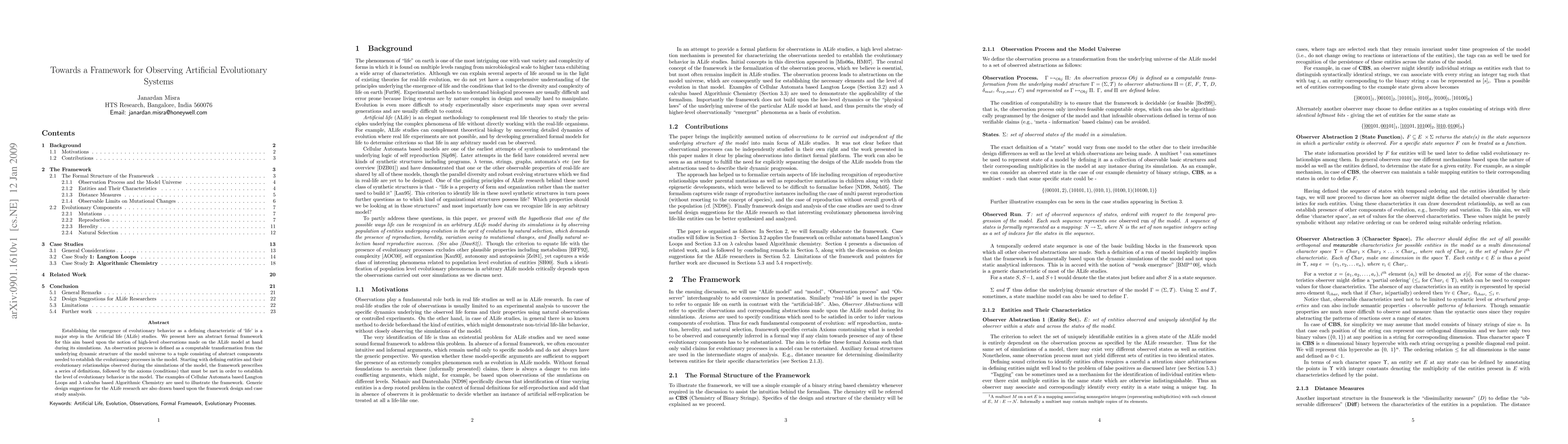 Establishing the emergence of evolutionary behavior as a defining characteristic of 'life' is a major step in the Artificial life (ALife) studies. We present here an abstract formal framework for this aim based upon the notion of high-level observations made on the ALife model at hand during its simulations. An observation process is defined as a computable transformation from the underlying dynamic structure of the model universe to a tuple consisting of abstract components needed to establish the evolutionary processes in the model. Starting with defining entities and their evolutionary relationships observed during the simulations of the model, the framework prescribes a series of definitions, followed by the axioms (conditions) that must be met in order to establish the level of evolutionary behavior in the model. The examples of Cellular Automata based Langton Loops and Lambda calculus based Algorithmic Chemistry are used to illustrate the framework. Generic design suggestions for the ALife research are also drawn based upon the framework design and case study analysis.