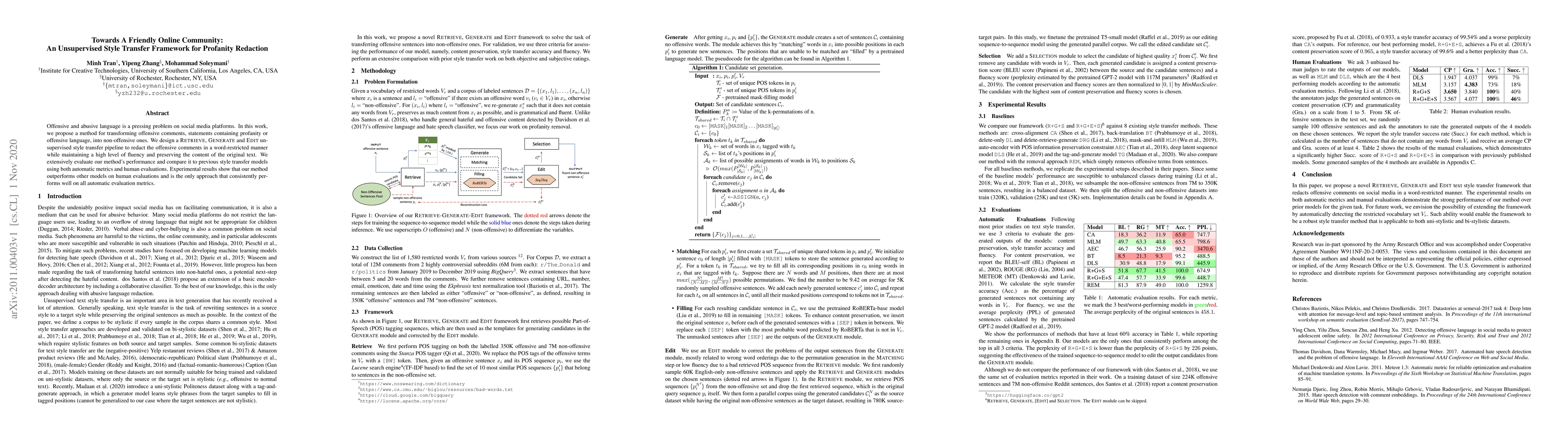 This paper proposes an unsupervised style transfer framework to redact profanity from offensive comments while maintaining text fluency and content. The method, consisting of RETRIEVE, GENERATE, and EDIT stages, outperforms previous models in both automatic metrics and human evaluations.