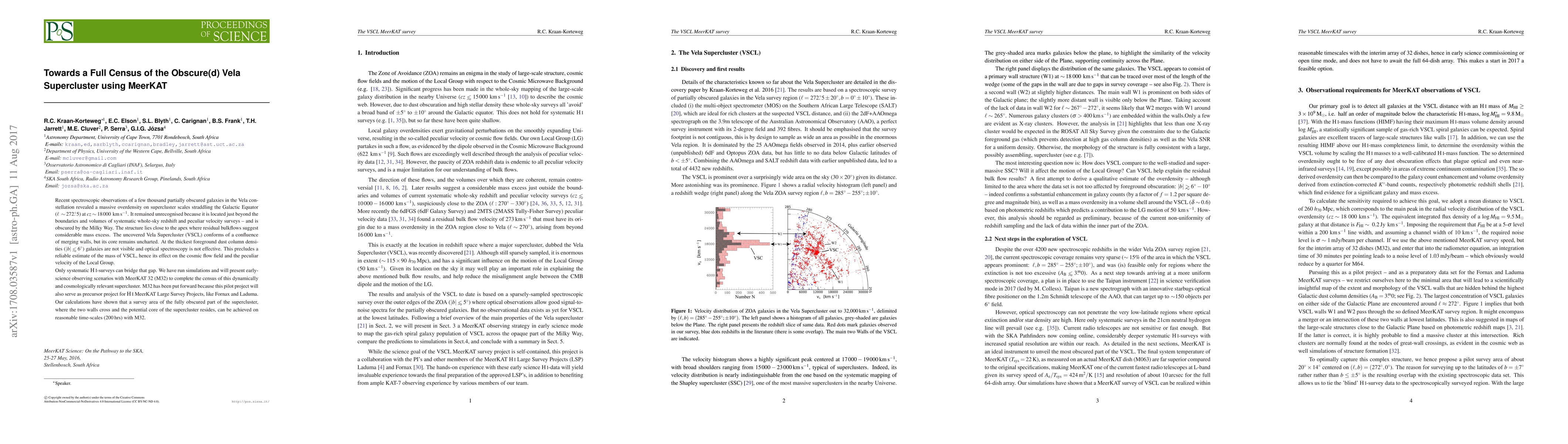 Recent spectroscopic observations of a few thousand partially obscured galaxies in the Vela constellation revealed a massive overdensity on supercluster scales straddling the Galactic Equator (l $\sim$ 272.5deg) at $cz \sim 18000$km/s. It remained unrecognised because it is located just beyond the boundaries and volumes of systematic whole-sky redshift and peculiar velocity surveys - and is obscured by the Milky Way. The structure lies close to the apex where residual bulkflows suggest considerable mass excess. The uncovered Vela Supercluster (VSCL) conforms of a confluence of merging walls, but its core remains uncharted. At the thickest foreground dust column densities (|b| < 6 deg) galaxies are not visible and optical spectroscopy is not effective. This precludes a reliable estimate of the mass of VSCL, hence its effect on the cosmic flow field and the peculiar velocity of the Local Group. Only systematic HI-surveys can bridge that gap. We have run simulations and will present early-science observing scenarios with MeerKAT 32 (M32) to complete the census of this dynamically and cosmologically relevant supercluster. M32 has been put forward because this pilot project will also serve as precursor project for HI MeerKAT Large Survey Projects, like Fornax and Laduma. Our calculations have shown that a survey area of the fully obscured part of the supercluster, where the two walls cross and the potential core of the supercluster resides, can be achieved on reasonable time-scales (200 hrs) with M32.
