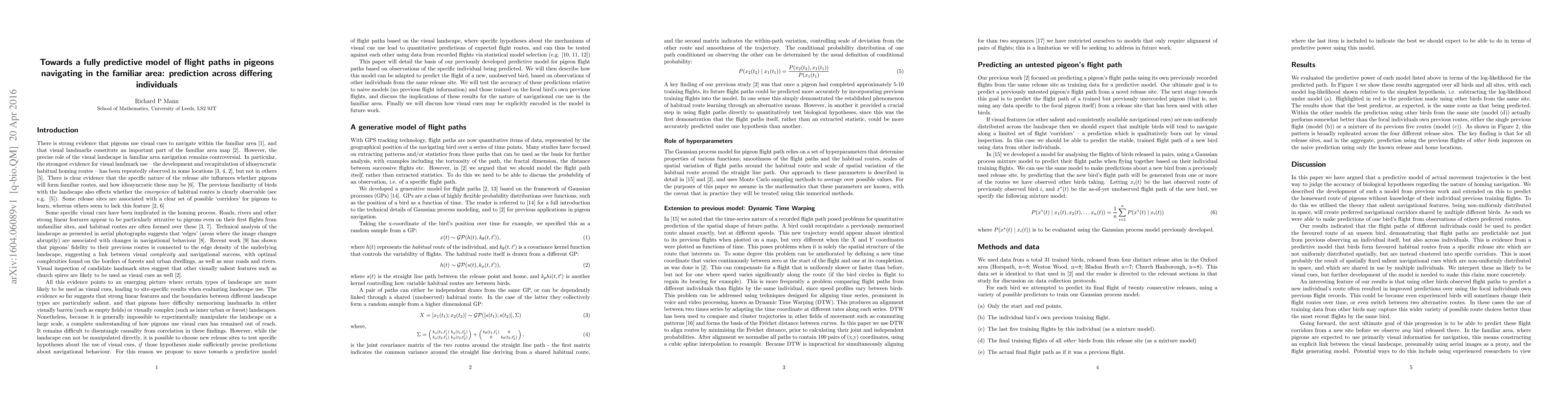 This paper will detail the basis of our previously developed predictive model for pigeon flight paths based on observations of the specific individual being predicted. We will then describe how this model can be adapted to predict the flight of a new, unobserved bird, based on observations of other individuals from the same release site. We will test the accuracy of these predictions relative to naive models with no previous flight information and those trained on the focal bird's own previous flights, and discuss the implications of these results for the nature of navigational cue use in the familiar area. Finally we will discuss how visual cues may be explicitly encoded in the model in future work.