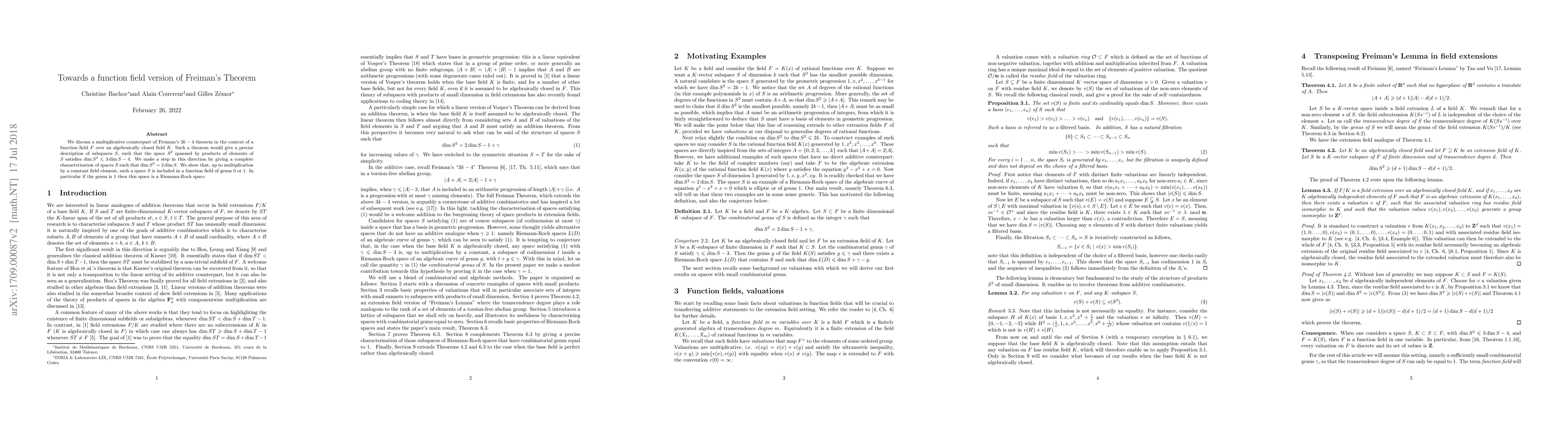 We discuss a multiplicative counterpart of Freiman's $3k-4$ theorem in the context of a function field $F$ over an algebraically closed field $K$. Such a theorem would give a precise description of subspaces $S$, such that the space $S^2$ spanned by products of elements of $S$ satisfies $\dim S^2 \leq 3 \dim S-4$. We make a step in this direction by giving a complete characterisation of spaces $S$ such that $\dim S^2 = 2 \dim S$. We show that, up to multiplication by a constant field element, such a space $S$ is included in a function field of genus $0$ or $1$. In particular if the genus is $1$ then this space is a Riemann-Roch space.