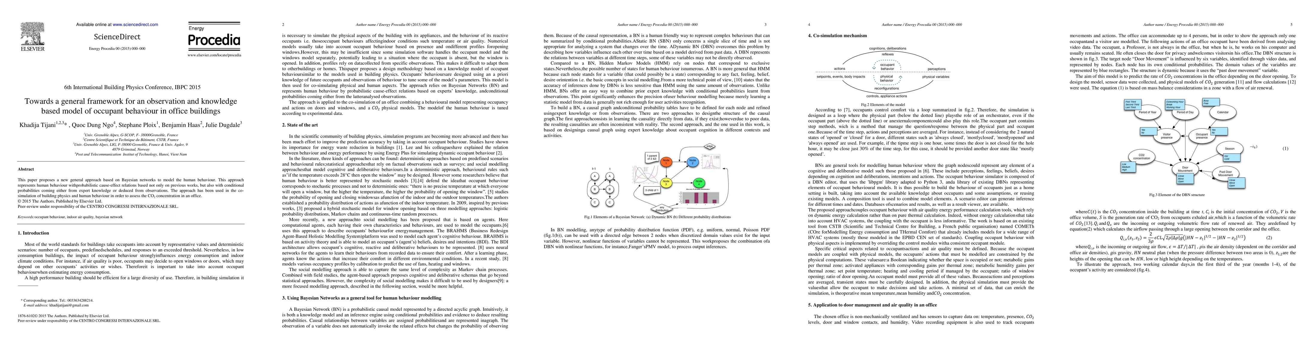 This paper proposes a new general approach based on Bayesian networks to model the human behaviour. This approach represents human behaviour withprobabilistic cause-effect relations based not only on previous works, but also with conditional probabilities coming either from expert knowledge or deduced from observations. The approach has been used in the co-simulation of building physics and human behaviour in order to assess the CO 2 concentration in an office.
