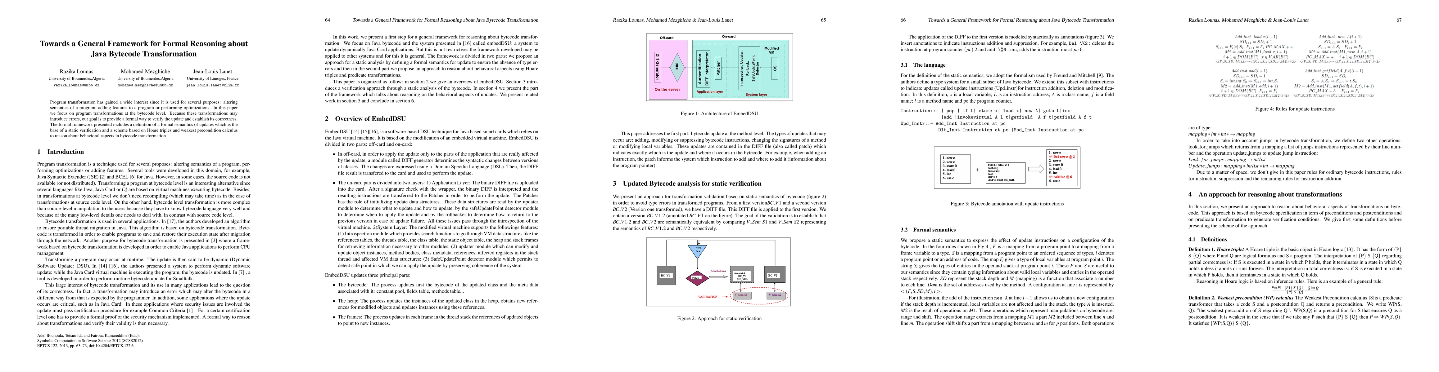This paper proposes a formal framework for verifying Java bytecode transformations, defining a formal semantics for updates and utilizing Hoare triples and weakest precondition calculus to ensure correctness and behavioral integrity.