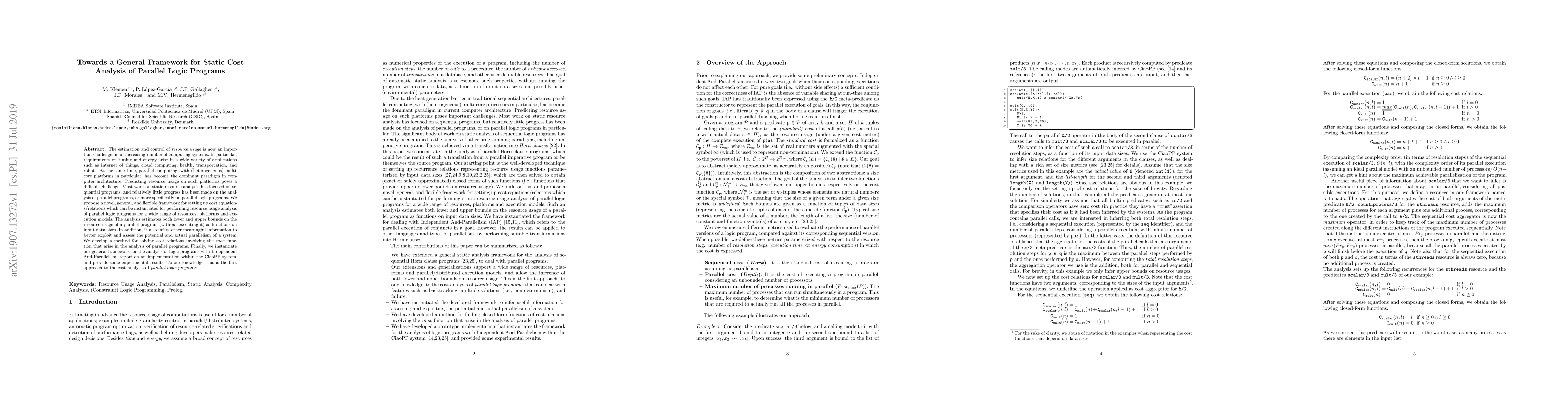 This paper proposes a novel framework for static cost analysis of parallel logic programs, aiming to estimate resource usage such as timing and energy. It introduces a method for solving cost relations involving the max function and demonstrates its application to logic programs with Independent And-Parallelism, providing experimental results within the CiaoPP system.