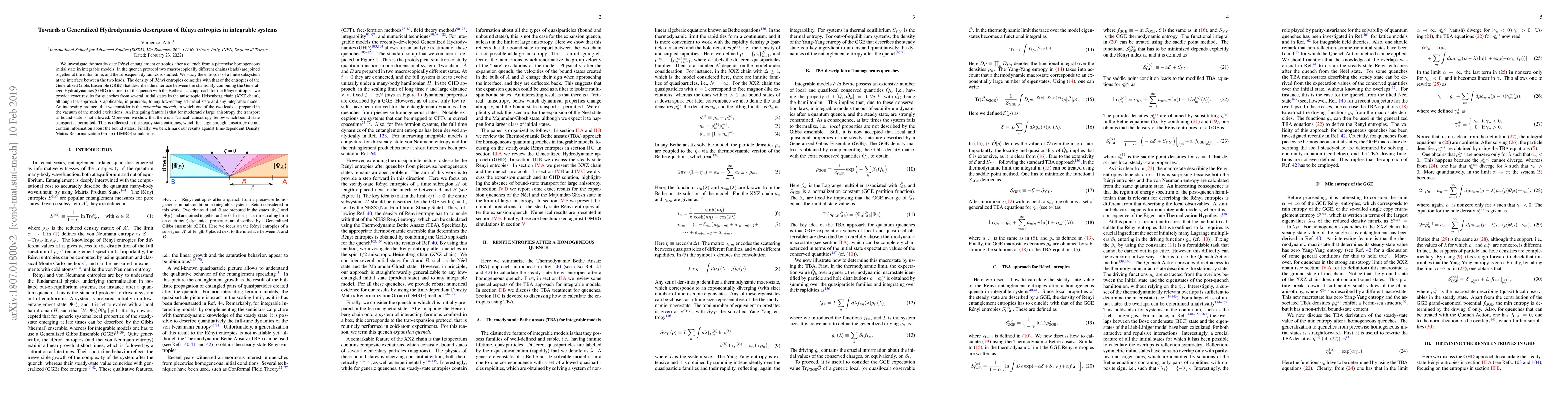 This paper explores the steady-state Rényi entanglement entropies in integrable systems after a quench, combining Generalized Hydrodynamics and Bethe ansatz methods to derive exact results for the anisotropic Heisenberg chain. It reveals a critical anisotropy threshold for bound-state transport, which is reflected in the Rényi entropies, and validates the findings with tDMRG simulations.