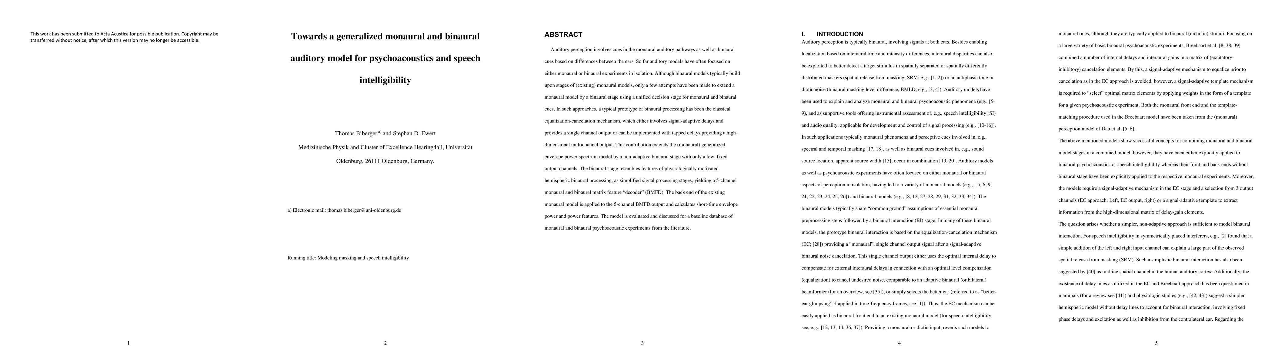 Auditory perception involves cues in the monaural auditory pathways as well as binaural cues based on differences between the ears. So far auditory models have often focused on either monaural or binaural experiments in isolation. Although binaural models typically build upon stages of (existing) monaural models, only a few attempts have been made to extend a monaural model by a binaural stage using a unified decision stage for monaural and binaural cues. In such approaches, a typical prototype of binaural processing has been the classical equalization-cancelation mechanism, which either involves signal-adaptive delays and provides a single channel output or can be implemented with tapped delays providing a high-dimensional multichannel output. This contribution extends the (monaural) generalized envelope power spectrum model by a non-adaptive binaural stage with only a few, fixed output channels. The binaural stage resembles features of physiologically motivated hemispheric binaural processing, as simplified signal processing stages, yielding a 5-channel monaural and binaural matrix feature "decoder" (BMFD). The back end of the existing monaural model is applied to the 5-channel BMFD output and calculates short-time envelope power and power features. The model is evaluated and discussed for a baseline database of monaural and binaural psychoacoustic experiments from the literature.
