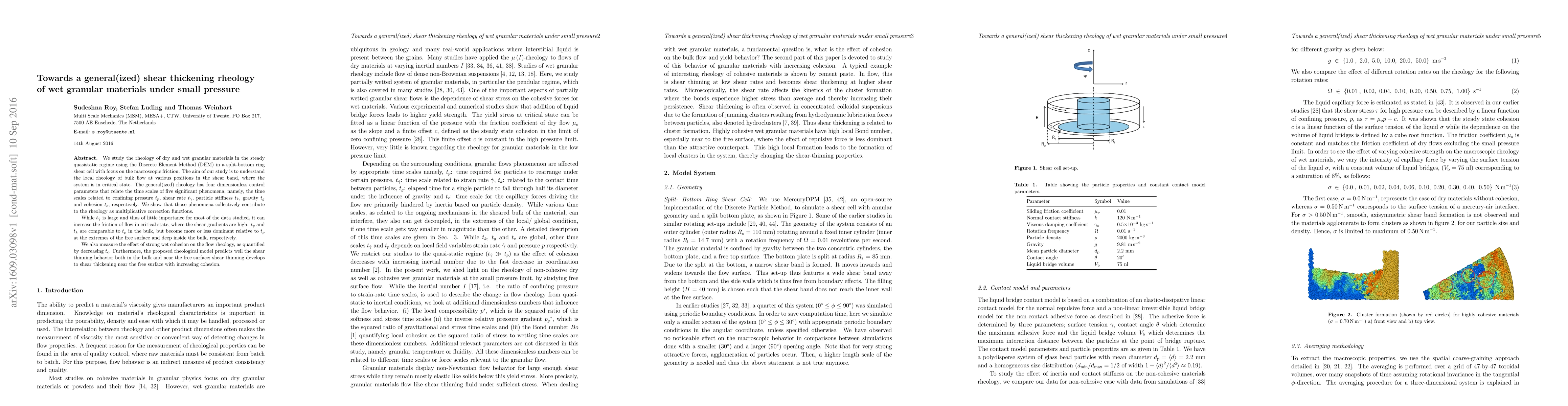 This study uses the Discrete Element Method to investigate the rheology of dry and wet granular materials under small pressure, focusing on macroscopic friction and the critical state of bulk flow. The research proposes a generalized rheological model with four dimensionless control parameters that collectively describe the time scales of five significant phenomena, predicting shear thinning behavior that transitions to shear thickening near the free surface with increased cohesion.
