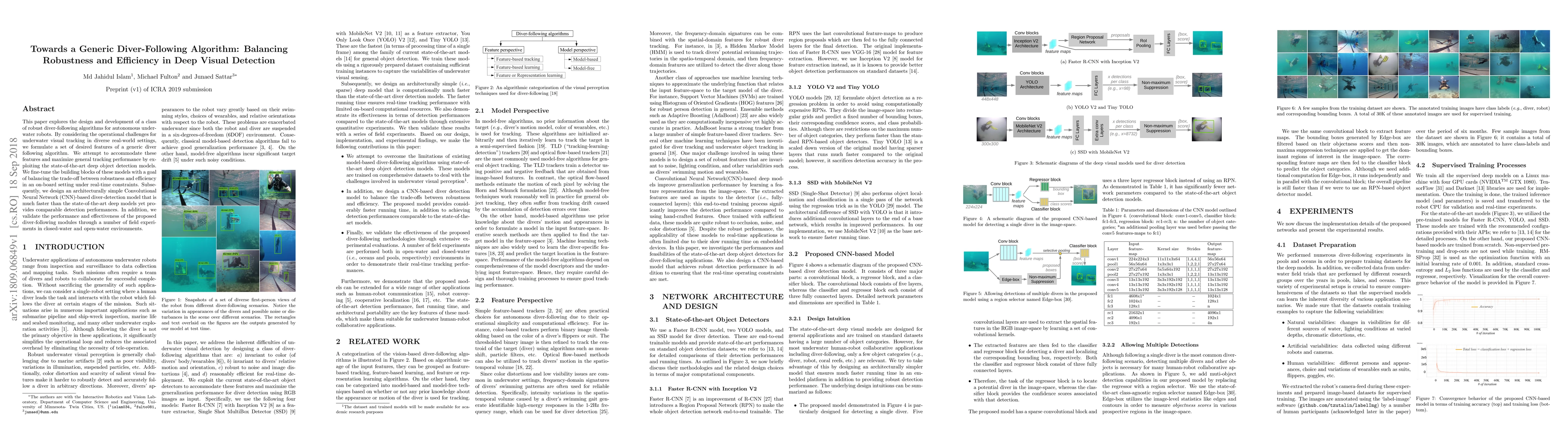 This paper explores the design and development of a class of robust diver-following algorithms for autonomous underwater robots. By considering the operational challenges for underwater visual tracking in diverse real-world settings, we formulate a set of desired features of a generic diver following algorithm. We attempt to accommodate these features and maximize general tracking performance by exploiting the state-of-the-art deep object detection models. We fine-tune the building blocks of these models with a goal of balancing the trade-off between robustness and efficiency in an onboard setting under real-time constraints. Subsequently, we design an architecturally simple Convolutional Neural Network (CNN)-based diver-detection model that is much faster than the state-of-the-art deep models yet provides comparable detection performances. In addition, we validate the performance and effectiveness of the proposed diver-following modules through a number of field experiments in closed-water and open-water environments.