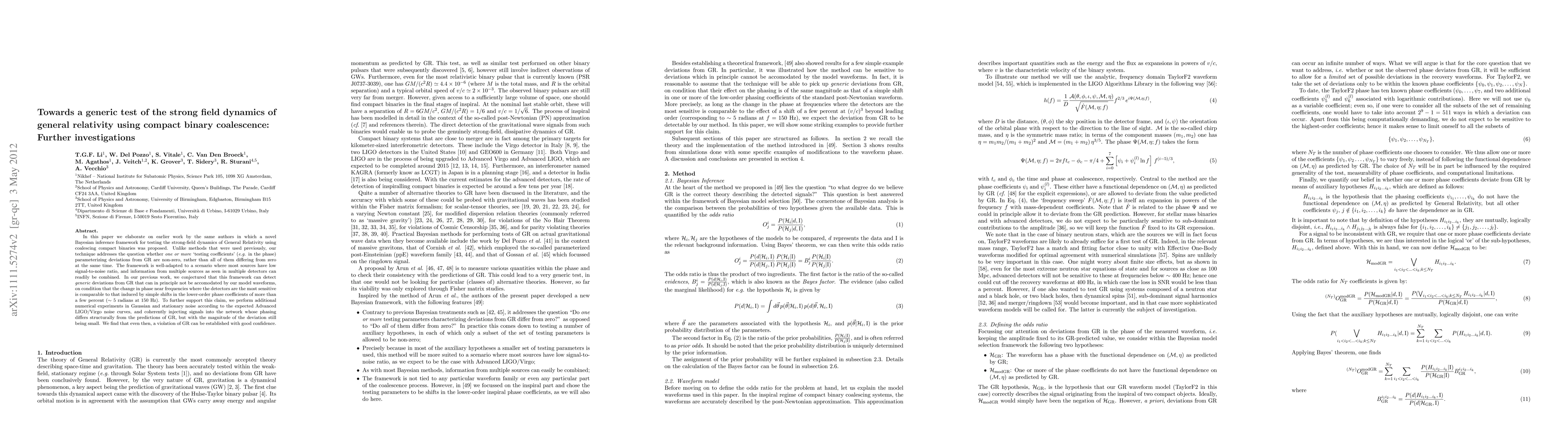 In this paper we elaborate on earlier work by the same authors in which a novel Bayesian inference framework for testing the strong-field dynamics of General Relativity using coalescing compact binaries was proposed. Unlike methods that were used previously, our technique addresses the question whether one or more 'testing coefficients' (e.g. in the phase) parameterizing deviations from GR are non-zero, rather than all of them differing from zero at the same time. The framework is well-adapted to a scenario where most sources have low signal-to-noise ratio, and information from multiple sources as seen in multiple detectors can readily be combined. In our previous work, we conjectured that this framework can detect generic deviations from GR that can in principle not be accomodated by our model waveforms, on condition that the change in phase near frequencies where the detectors are the most sensitive is comparable to that induced by simple shifts in the lower-order phase coefficients of more than a few percent ($\sim 5$ radians at 150 Hz). To further support this claim, we perform additional numerical experiments in Gaussian and stationary noise according to the expected Advanced LIGO/Virgo noise curves, and coherently injecting signals into the network whose phasing differs structurally from the predictions of GR, but with the magnitude of the deviation still being small. We find that even then, a violation of GR can be established with good confidence.