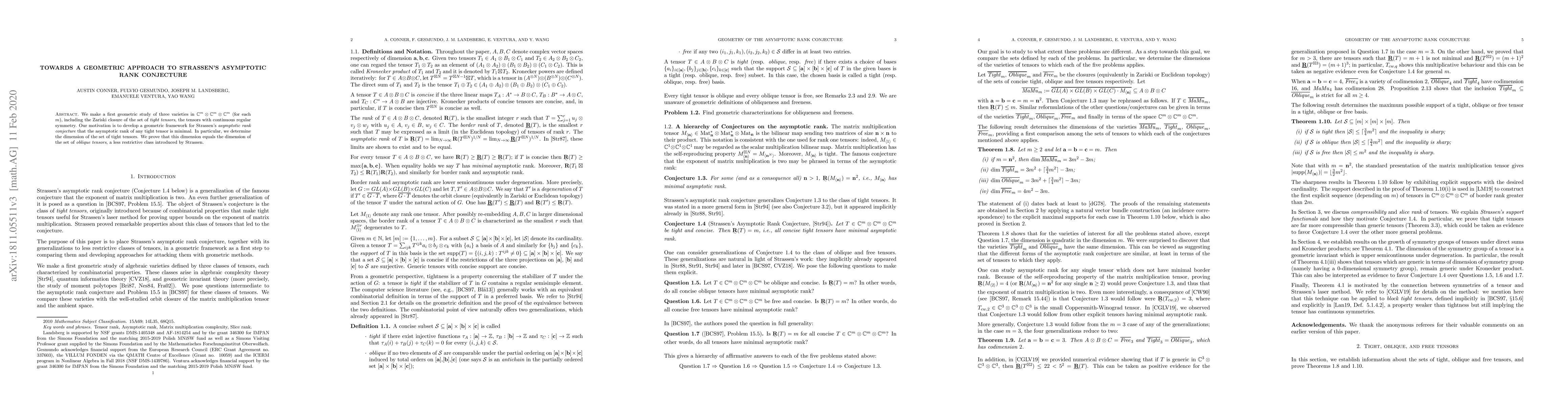 This research explores the geometric properties of three varieties in complex tensor spaces to develop a framework for Strassen's Asymptotic Rank Conjecture. The study finds that the dimension of the set of tight tensors matches that of oblique tensors, supporting the conjecture that tight tensors have minimal asymptotic rank.