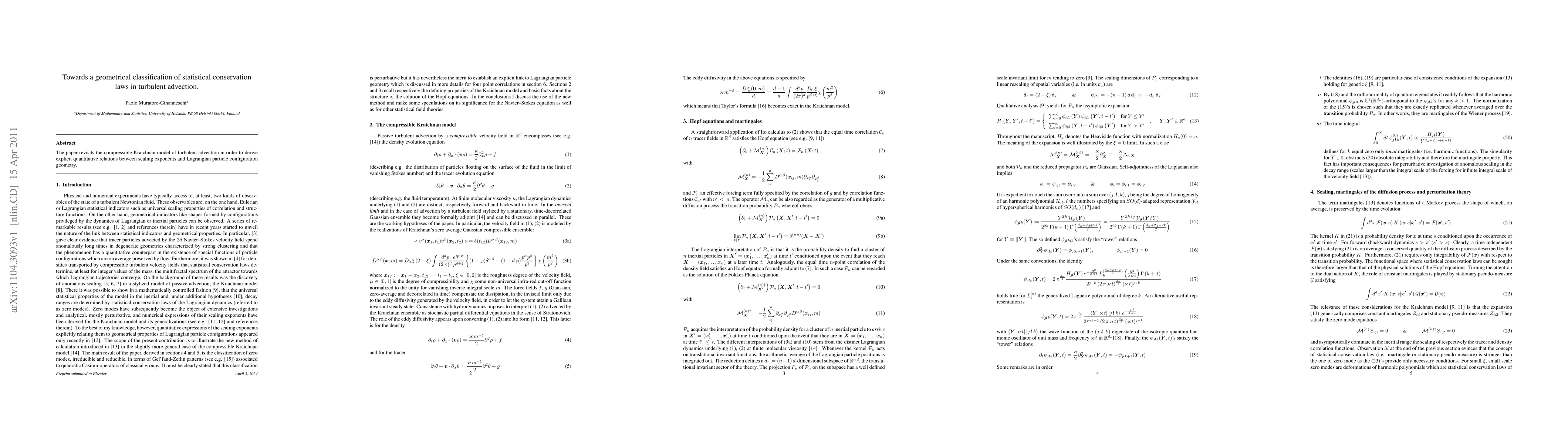 Summary: This paper explores the compressible Kraichnan model of turbulent advection to establish clear quantitative connections between scaling exponents and the geometry of Lagrangian particle configurations, aiming for a geometrical classification of statistical conservation laws.