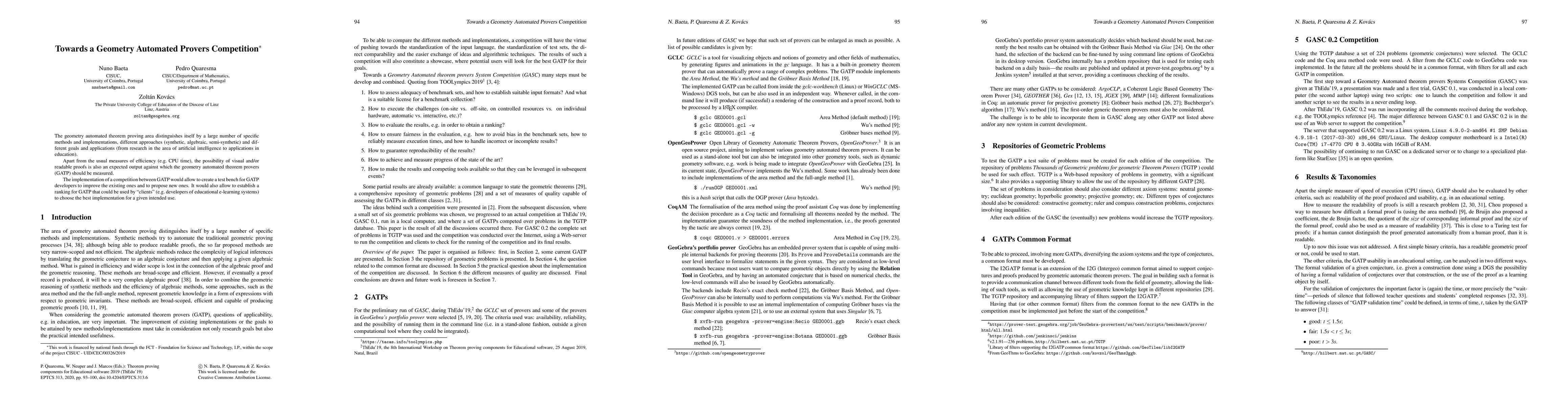 The paper proposes a competition for geometry automated theorem provers (GATP) to evaluate various methods and implementations based on efficiency, visual proofs, and readability. Such a competition aims to improve existing GATP and help developers choose the best tools for educational and AI applications.
