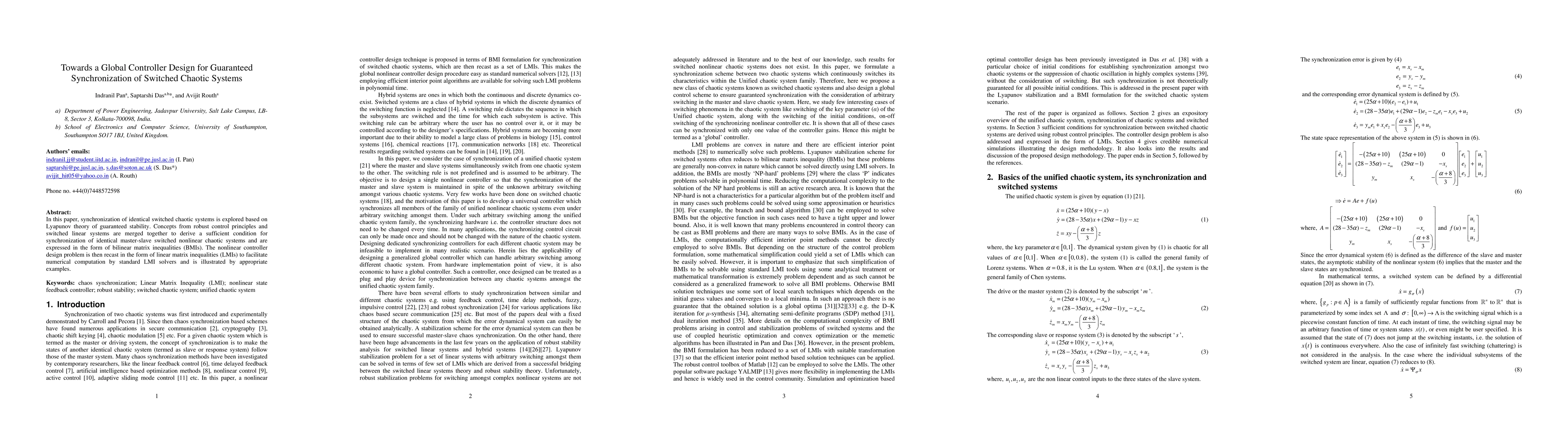 This paper develops a global controller design for synchronizing identical switched chaotic systems using Lyapunov theory and robust control principles. The synchronization condition is formulated as bilinear matrix inequalities (BMIs) and then converted into linear matrix inequalities (LMIs) for practical computation.