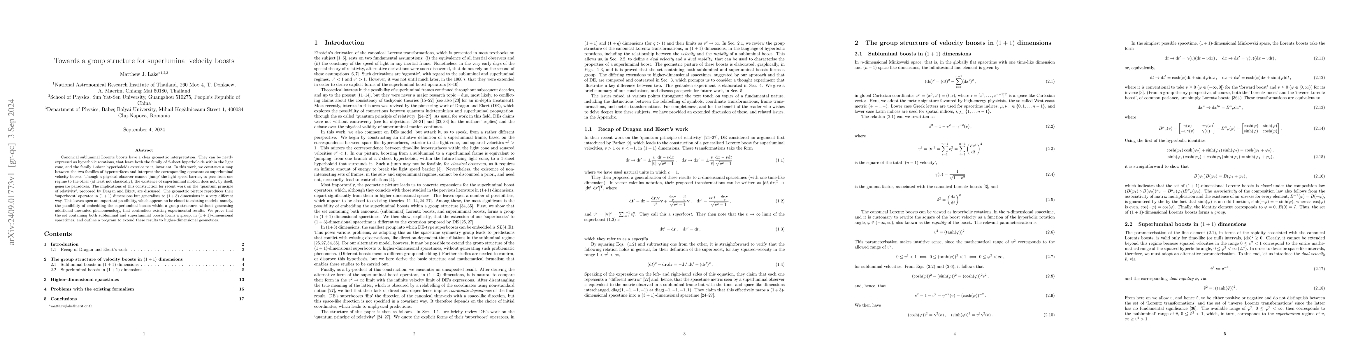 This paper constructs a map between subluminal and superluminal velocity boosts, interpreting them as hyperbolic rotations and demonstrating that these boosts can be embedded within a group structure in $(1+1)$-dimensional spacetimes. It discusses implications for the quantum principle of relativity and outlines a plan to extend these findings to higher dimensions.