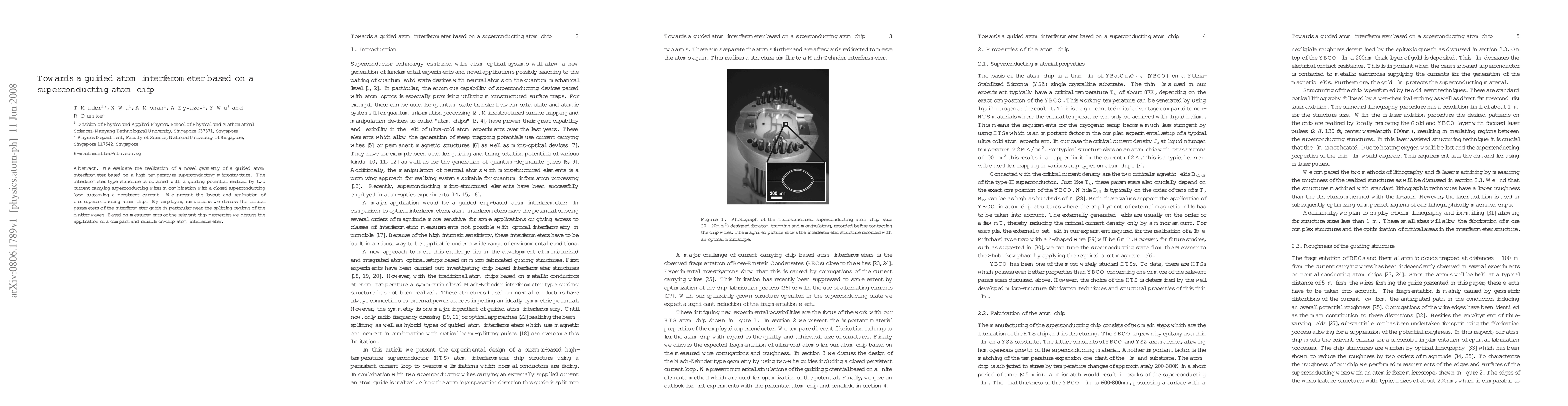 We evaluate the realization of a novel geometry of a guided atom interferometer based on a high temperature superconducting microstructure. The interferometer type structure is obtained with a guiding potential realized by two current carrying superconducting wires in combination with a closed superconducting loop sustaining a persistent current. We present the layout and realization of our superconducting atom chip. By employing simulations we discuss the critical parameters of the interferometer guide in particular near the splitting regions of the matter waves. Based on measurements of the relevant chip properties we discuss the application of a compact and reliable on-chip atom interferometer.