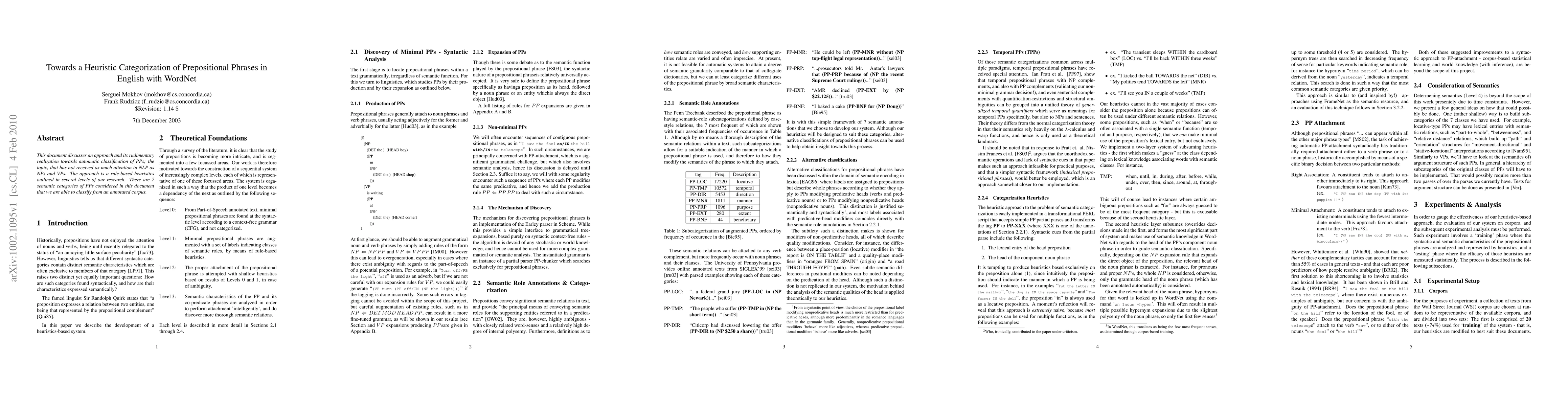 This document discusses an approach and its rudimentary realization towards automatic classification of PPs; the topic, that has not received as much attention in NLP as NPs and VPs. The approach is a rule-based heuristics outlined in several levels of our research. There are 7 semantic categories of PPs considered in this document that we are able to classify from an annotated corpus.