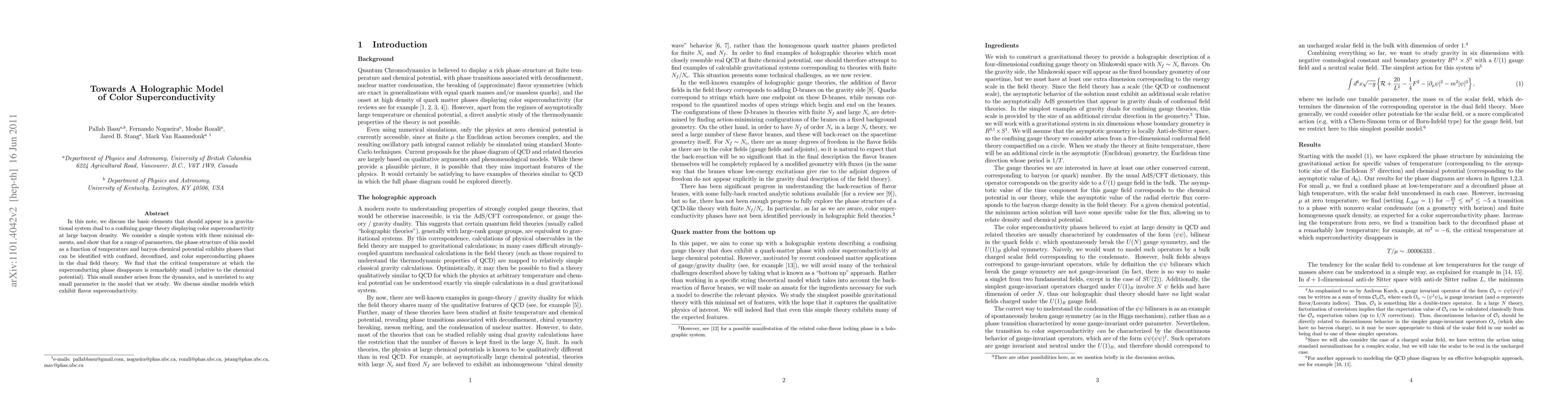 In this note, we discuss the basic elements that should appear in a gravitational system dual to a confining gauge theory displaying color superconductivity at large baryon density. We consider a simple system with these minimal elements, and show that for a range of parameters, the phase structure of this model as a function of temperature and baryon chemical potential exhibits phases that can be identified with confined, deconfined, and color superconducting phases in the dual field theory. We find that the critical temperature at which the superconducting phase disappears is remarkably small (relative to the chemical potential). This small number arises from the dynamics, and is unrelated to any small parameter in the model that we study. We discuss similar models which exhibit flavor superconductivity.