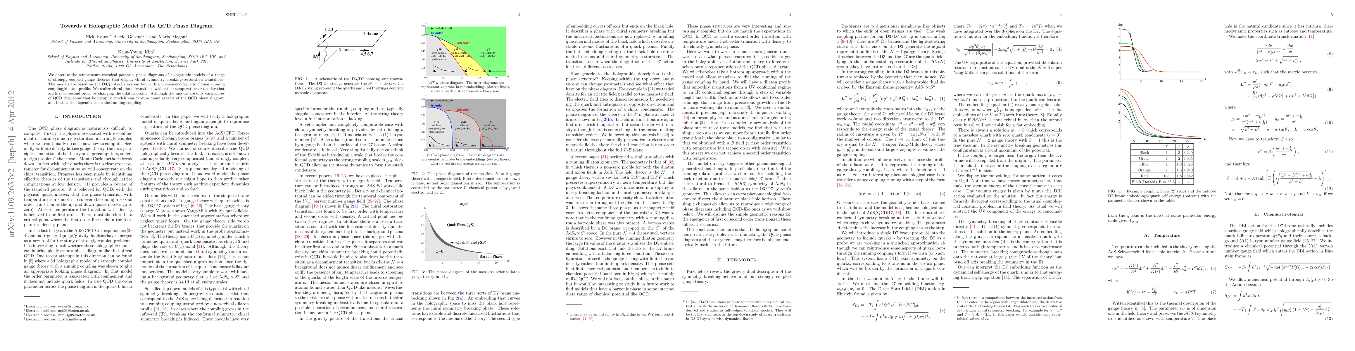 The paper presents a holographic model of the QCD phase diagram using a D3/probe-D7 system with a phenomenologically chosen running coupling/dilaton profile, demonstrating the realization of chiral symmetry breaking/restoration transitions.