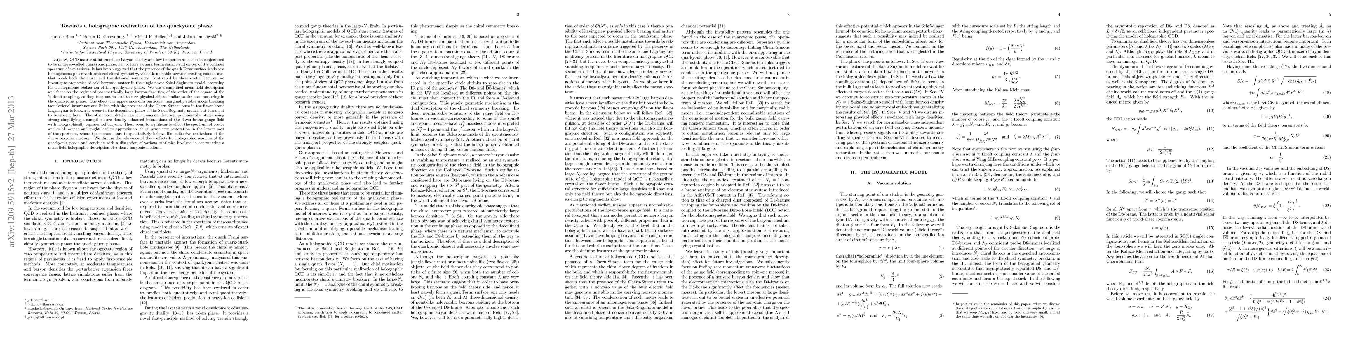 This research explores a holographic model for the quarkyonic phase in QCD matter, focusing on large-N_c limits, baryon density, and low temperatures. Utilizing the Sakai-Sugimoto model, the study identifies two key phenomena: a marginally stable mode absent in the quarkyonic regime and density-enhanced flavor brane-baryon interactions. These interactions potentially cause approximate chiral symmetry restoration in vector and axial meson spectra, suggesting the holographic model captures essential features of the quarkyonic phase.