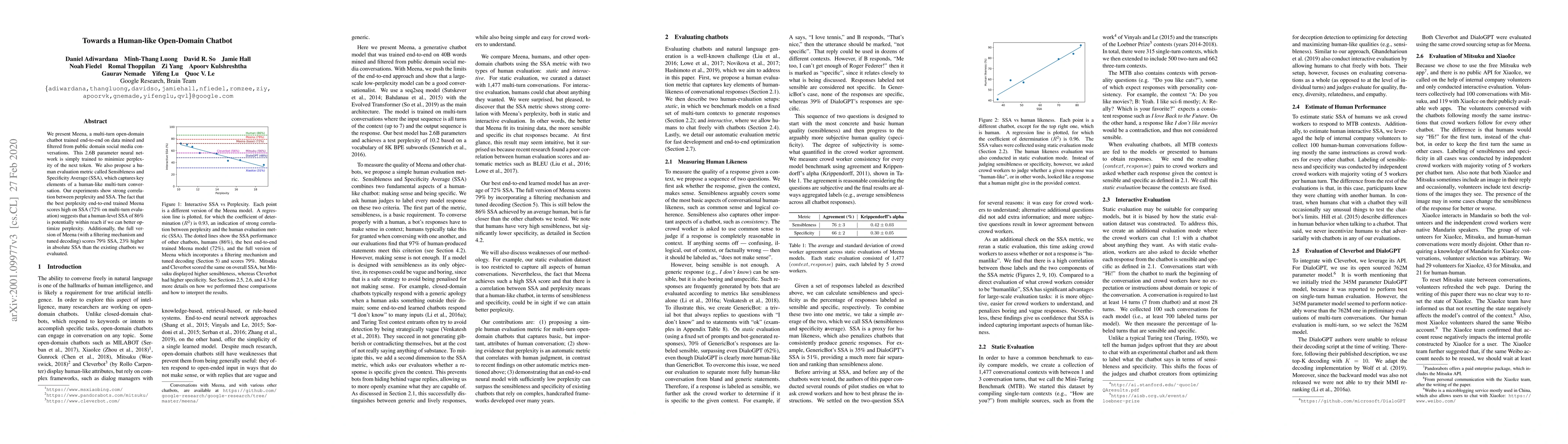 This paper introduces Meena, a 2.6B parameter chatbot trained on social media data, achieving high perplexity and a Sensibleness and Specificity Average (SSA) of 72% in multi-turn conversations. The authors propose SSA as a metric to evaluate human-likeness, suggesting that further optimization of perplexity could reach a human-level SSA of 86%.