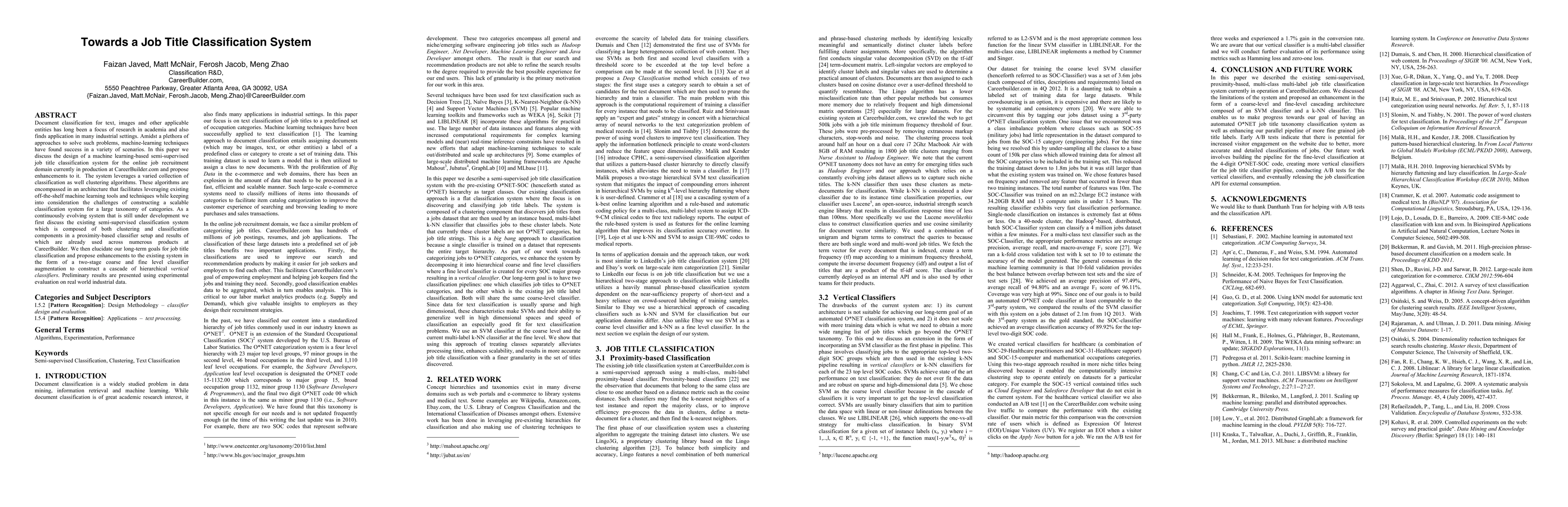 This paper presents a machine learning-based semi-supervised job title classification system for online recruitment, currently operational at CareerBuilder.com, and proposes enhancements including a two-stage coarse and fine level classifier to improve the system's scalability and accuracy.
