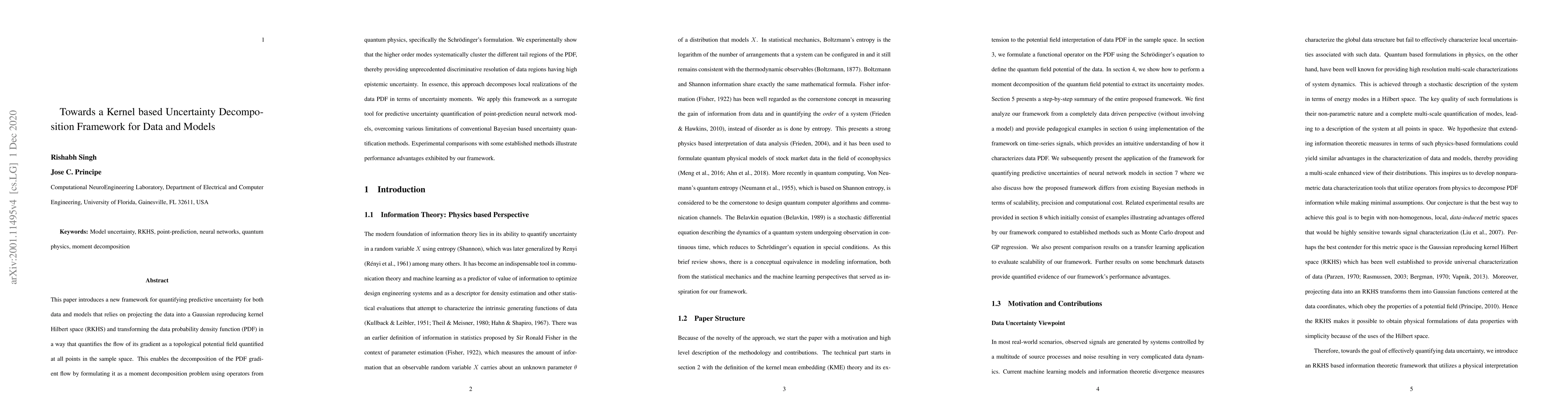 This paper introduces a new framework for quantifying predictive uncertainty for both data and models that relies on projecting the data into a Gaussian reproducing kernel Hilbert space (RKHS) and transforming the data probability density function (PDF) in a way that quantifies the flow of its gradient as a topological potential field quantified at all points in the sample space. This enables the decomposition of the PDF gradient flow by formulating it as a moment decomposition problem using operators from quantum physics, specifically the Schrodinger's formulation. We experimentally show that the higher order modes systematically cluster the different tail regions of the PDF, thereby providing unprecedented discriminative resolution of data regions having high epistemic uncertainty. In essence, this approach decomposes local realizations of the data PDF in terms of uncertainty moments. We apply this framework as a surrogate tool for predictive uncertainty quantification of point-prediction neural network models, overcoming various limitations of conventional Bayesian based uncertainty quantification methods. Experimental comparisons with some established methods illustrate performance advantages exhibited by our framework.