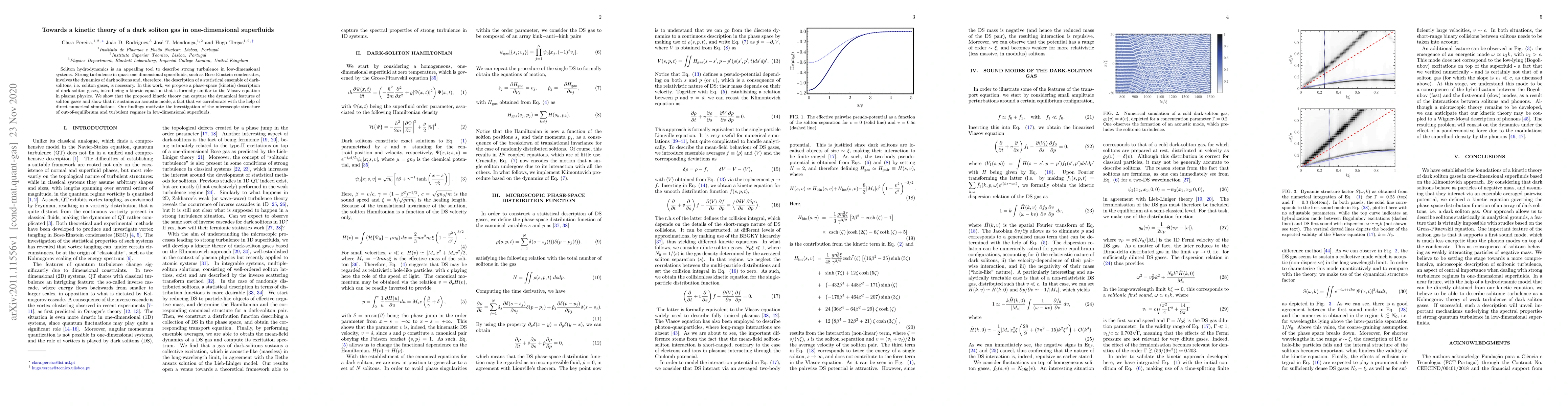 This paper proposes a kinetic theory for dark soliton gases in one-dimensional superfluids, introducing a phase-space description akin to the Vlasov equation. The developed kinetic equation successfully captures the dynamics of soliton gases and supports the existence of an acoustic mode, as confirmed by numerical simulations.