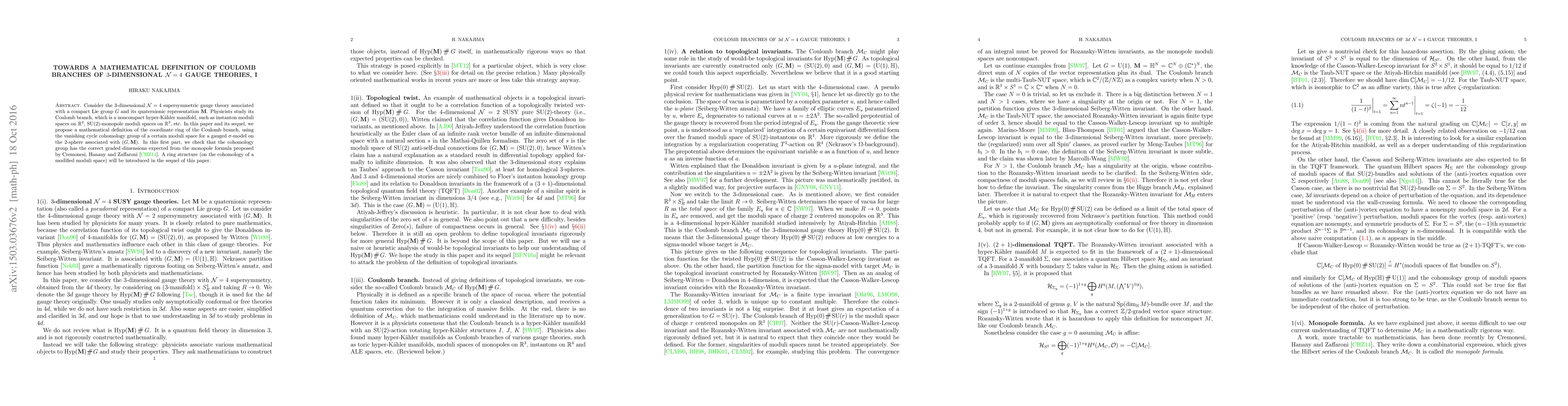 This paper proposes a mathematical definition for the coordinate ring of the Coulomb branch in 3-dimensional $\mathcal N=4$ supersymmetric gauge theories, using vanishing cycle cohomology from a gauged $\sigma$-model on the 2-sphere. The first part verifies that the cohomology group dimensions align with the monopole formula from Cremonesi, Hanany, and Zaffaroni.