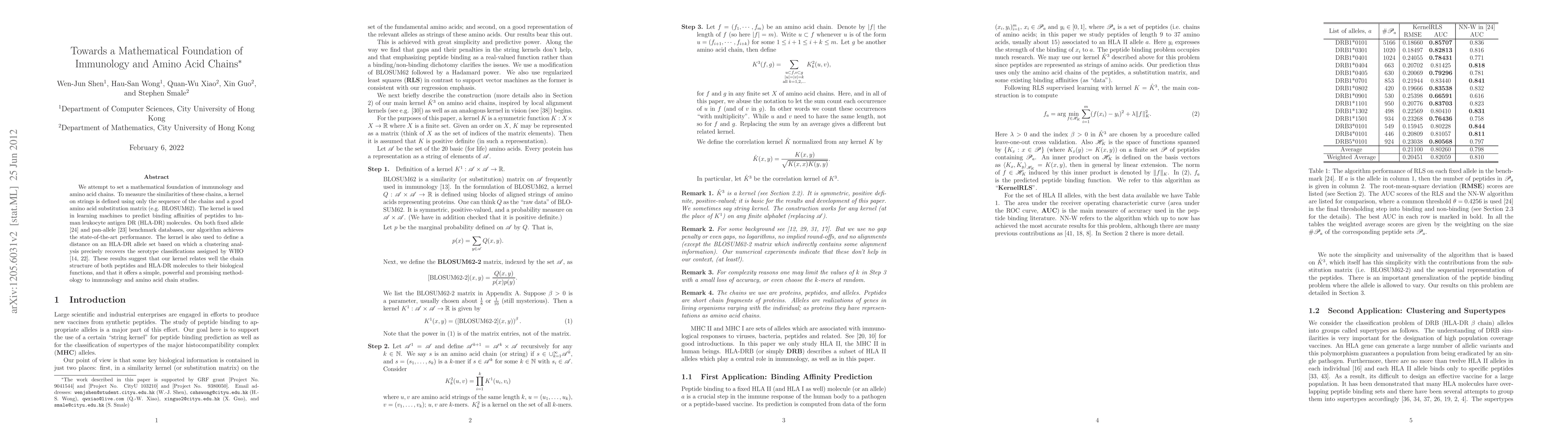 This paper establishes a mathematical foundation for immunology using a kernel on amino acid chains to predict peptide binding affinities to HLA-DR molecules, achieving state-of-the-art performance. The kernel also enables precise clustering of HLA-DR alleles, aligning well with WHO serotype classifications.