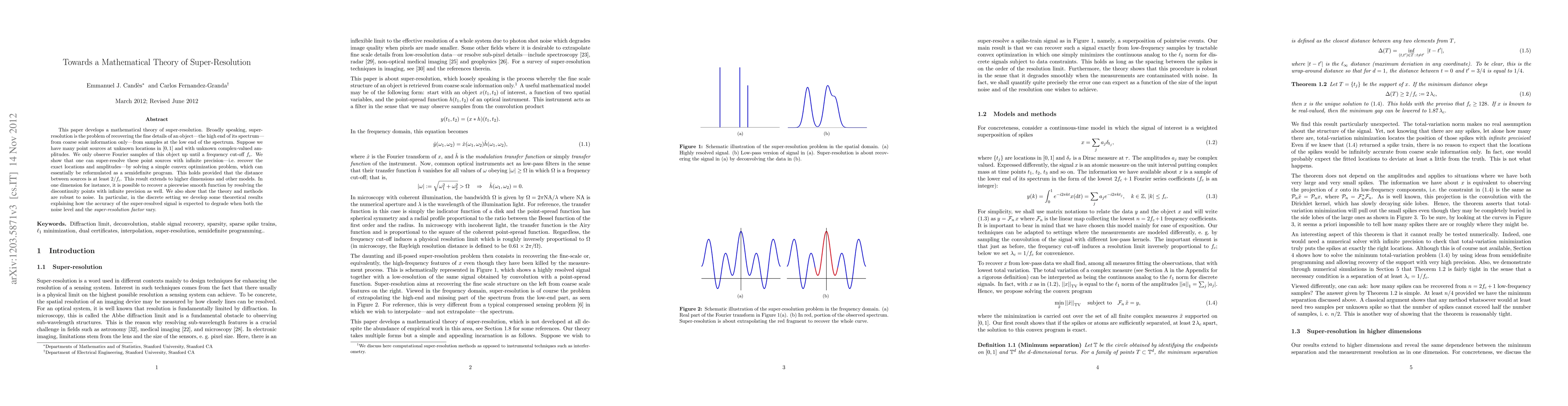 This paper proposes a mathematical framework for super-resolution, enabling the precise recovery of fine details from coarse data by solving a convex optimization problem. The method is robust to noise and extends to higher dimensions, allowing for the exact resolution of point sources and discontinuity points in functions.
