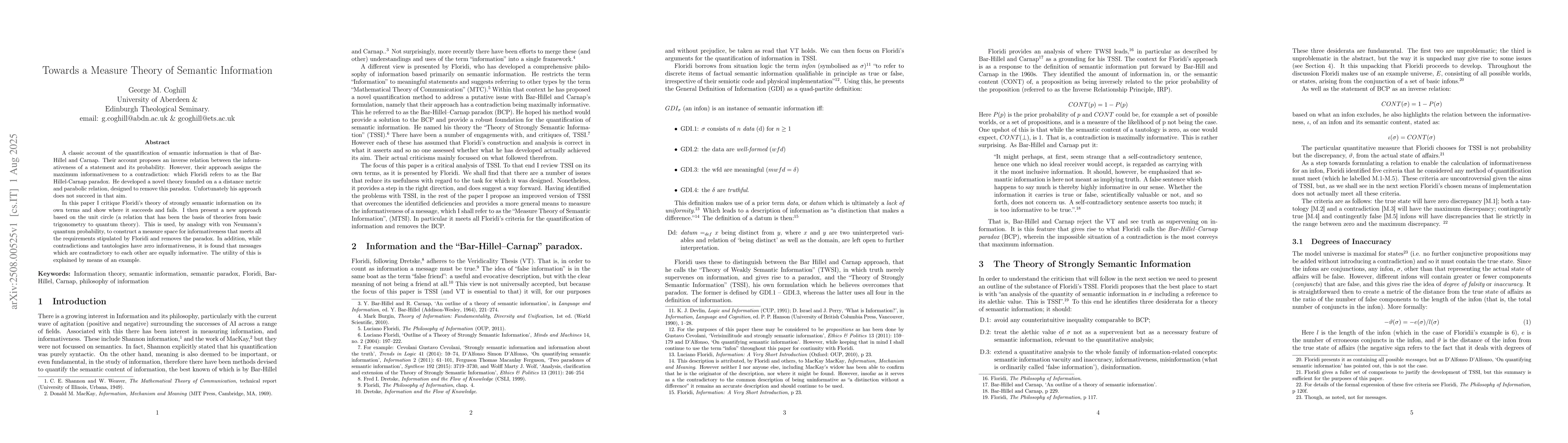 A classic account of the quantification of semantic information is that of Bar-Hiller and Carnap. Their account proposes an inverse relation between the informativeness of a statement and its probability. However, their approach assigns the maximum informativeness to a contradiction: which Floridi refers to as the Bar-Hillel-Carnap paradox. He developed a novel theory founded on a distance metric and parabolic relation, designed to remove this paradox. Unfortunately is approach does not succeed in that aim. In this paper I critique Floridi's theory of strongly semantic information on its own terms and show where it succeeds and fails. I then present a new approach based on the unit circle (a relation that has been the basis of theories from basic trigonometry to quantum theory). This is used, by analogy with von Neumann's quantum probability to construct a measure space for informativeness that meets all the requirements stipulated by Floridi and removes the paradox. In addition, while contradictions and tautologies have zero informativeness, it is found that messages which are contradictory to each other are equally informative. The utility of this is explained by means of an example.