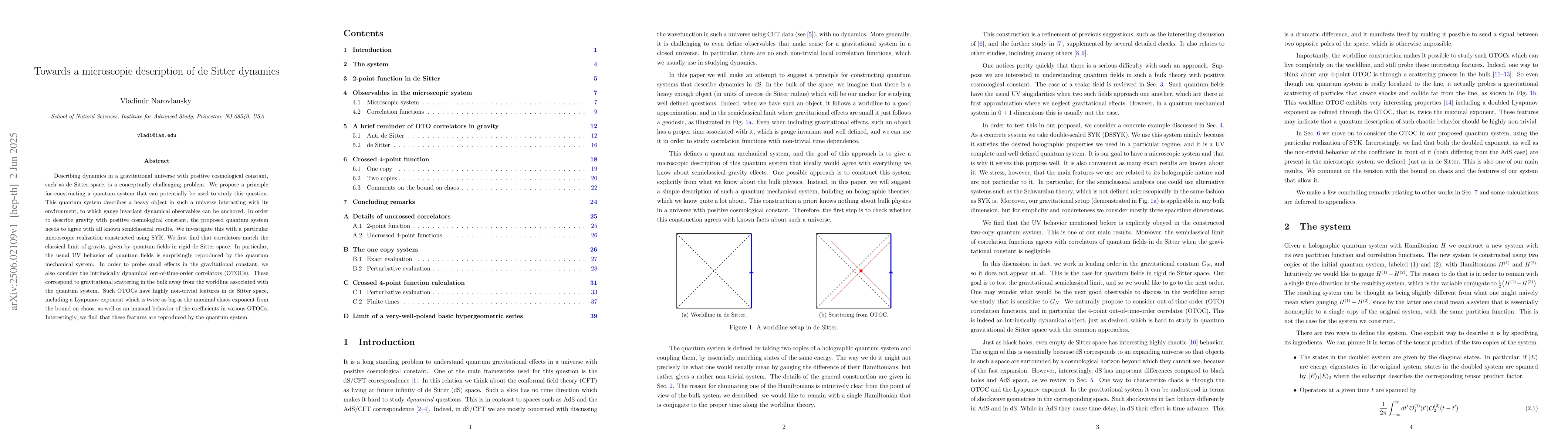 Describing dynamics in a gravitational universe with positive cosmological constant, such as de Sitter space, is a conceptually challenging problem. We propose a principle for constructing a quantum system that can potentially be used to study this question. This quantum system describes a heavy object in such a universe interacting with its environment, to which gauge invariant dynamical observables can be anchored. In order to describe gravity with positive cosmological constant, the proposed quantum system needs to agree with all known semiclassical results. We investigate this with a particular microscopic realization constructed using SYK. We first find that correlators match the classical limit of gravity, given by quantum fields in rigid de Sitter space. In particular, the usual UV behavior of quantum fields is surprisingly reproduced by the quantum mechanical system. In order to probe small effects in the gravitational constant, we also consider the intrinsically dynamical out-of-time-order correlators (OTOCs). These correspond to gravitational scattering in the bulk away from the worldline associated with the quantum system. Such OTOCs have highly non-trivial features in de Sitter space, including a Lyapunov exponent which is twice as big as the maximal chaos exponent from the bound on chaos, as well as an unusual behavior of the coefficients in various OTOCs. Interestingly, we find that these features are reproduced by the quantum system.