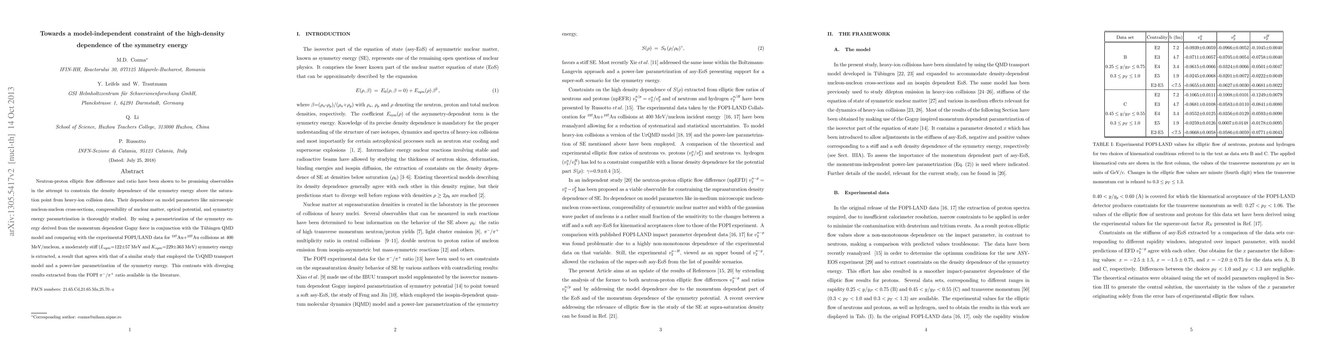 Neutron-proton elliptic flow difference and ratio have been shown to be promising observables in the attempt to constrain the density dependence of the symmetry energy above the saturation point from heavy-ion collision data. Their dependence on model parameters like microscopic nucleon-nucleon cross-sections, compressibility of nuclear matter, optical potential, and symmetry energy parametrization is thoroughly studied. By using a parametrization of the symmetry energy derived from the momentum dependent Gogny force in conjunction with the T\"{u}bingen QMD model and comparing with the experimental FOPI/LAND data for 197Au+197Au collisions at 400 MeV/nucleon, a moderately stiff, x=-1.35 +/- 1.25, symmetry energy is extracted, a result that agrees with that of a similar study that employed the UrQMD transport model and a momentum independent power-law parametrization of the symmetry energy. This contrasts with diverging results extracted from the FOPI $\pi^{-}/\pi^{+}$ ratio available in the literature.