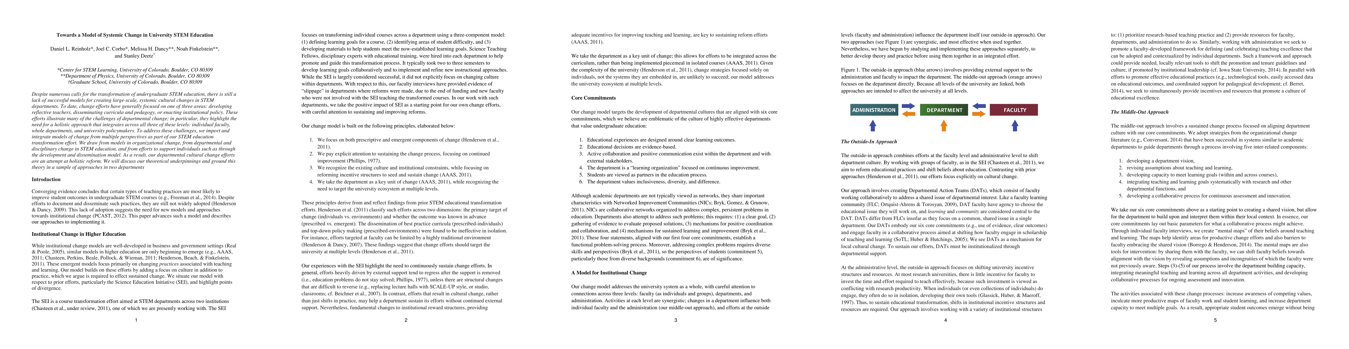 Despite numerous calls for the transformation of undergraduate STEM education, there is still a lack of successful models for creating large-scale, systemic cultural changes in STEM departments. To date, change efforts have generally focused on one of three areas: developing reflective teachers, disseminating curricula and pedagogy, or enacting institutional policy. These efforts illustrate many of the challenges of departmental change; in particular, they highlight the need for a holistic approach that integrates across all three of these levels: individual faculty, whole departments, and university policymakers. To address these challenges, as part of our campus-wide AAU-sponsored effort in STEM education transformation, we import and integrate models of change from multiple perspectives. We draw from models in organizational change, from departmental and disciplinary change in STEM education, and from efforts to support individual efforts such as the development and dissemination model. As a result, our departmental cultural change efforts are an attempt at holistic reform. We will discuss our theoretical underpinnings and ground this theory in a sample of approaches in two departments.