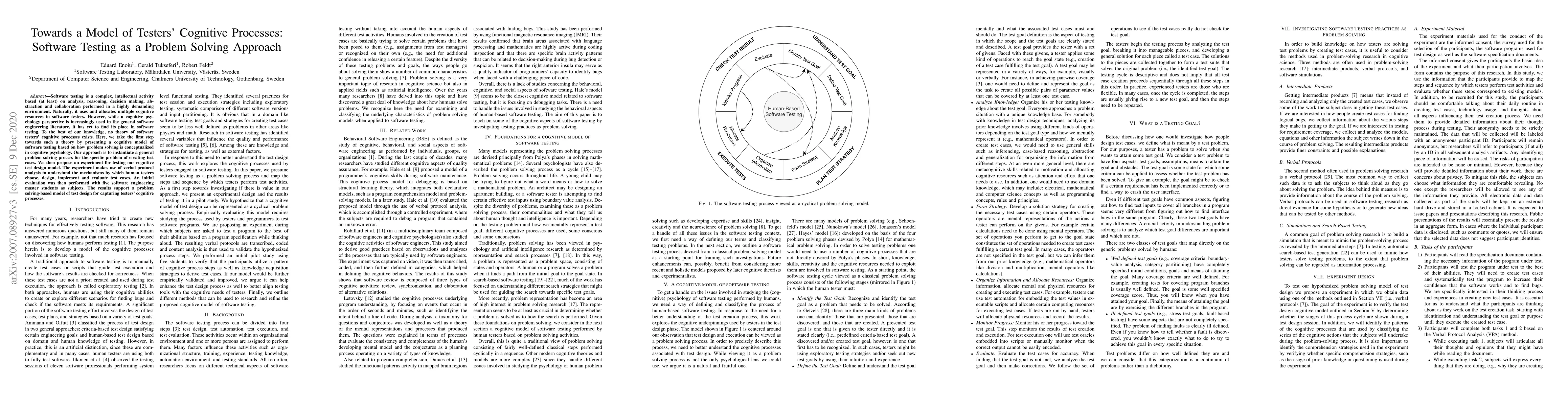This paper proposes a cognitive model for software testing based on problem-solving processes, aiming to understand testers' cognitive activities. An experiment using verbal protocol analysis with five master students supports the model, indicating it captures testers' cognitive processes in test case design.