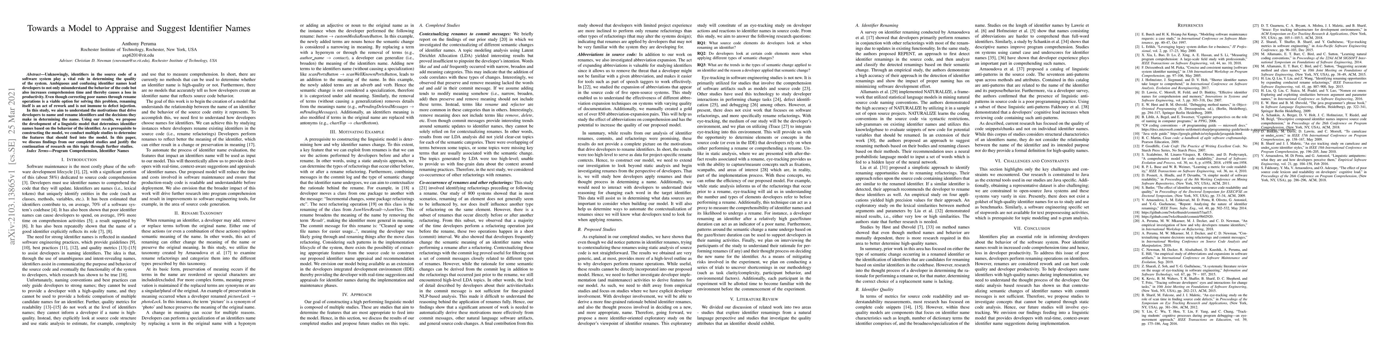 Researchers aim to develop a model that suggests optimal identifier names based on their behavior, improving software quality and developer productivity. By analyzing developer motivations and naming decisions, the study seeks to create a linguistic model that can automatically suggest better name choices.