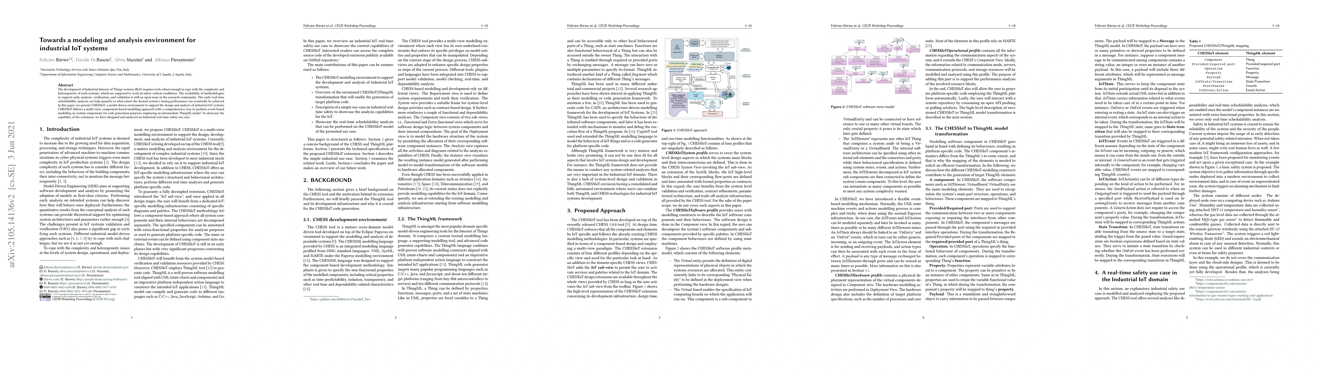 This paper introduces CHESSIoT, a model-driven environment for designing and analyzing industrial IoT systems, addressing the complexity and heterogeneity of such systems. It employs a multi-view, component-based modelling approach with ThingML for early real-time schedulability analysis and code generation.