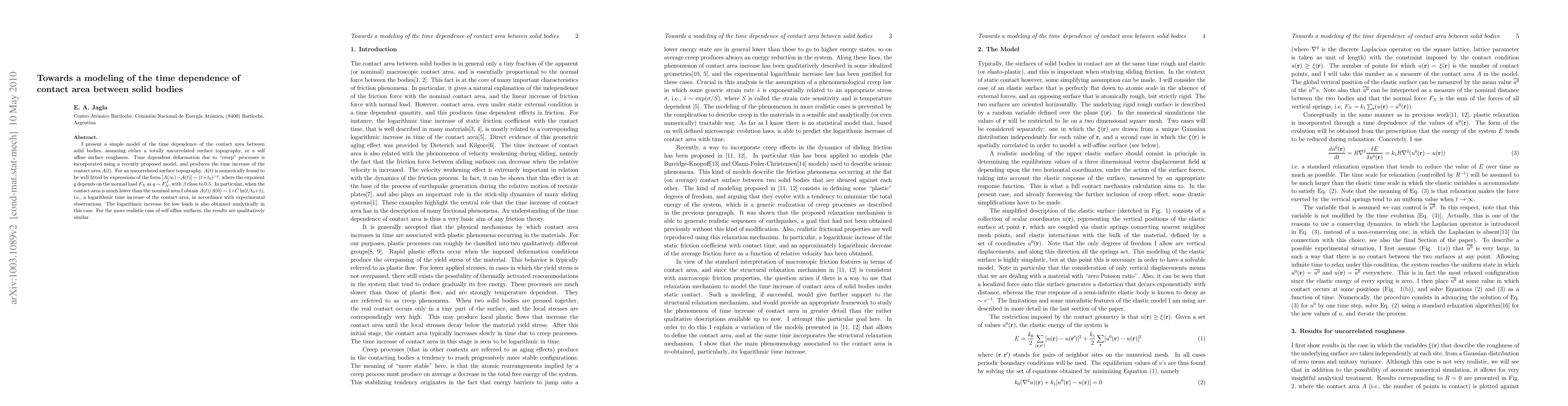 I present a simple model of the time dependence of the contact area between solid bodies, assuming either a totally uncorrelated surface topography, or a self affine surface roughness. The existence of relaxation effects (that I incorporate using a recently proposed model) produces the time increase of the contact area $A(t)$ towards an asymptotic value that can be much smaller than the nominal contact area. For an uncorrelated surface topography, the time evolution of $A(t)$ is numerically found to be well fitted by expressions of the form [$A(\infty)-A(t)]\sim (t+t_0)^{-q}$, where the exponent $q$ depends on the normal load $F_N$ as $q\sim F_N^{\beta}$, with $\beta$ close to 0.5. In particular, when the contact area is much lower than the nominal area I obtain $A(t)/A(0) \sim 1+C\ln(t/t_0+1)$, i.e., a logarithmic time increase of the contact area, in accordance with experimental observations. The logarithmic increase for low loads is also obtained analytically in this case. For the more realistic case of self affine surfaces, the results are qualitatively similar.