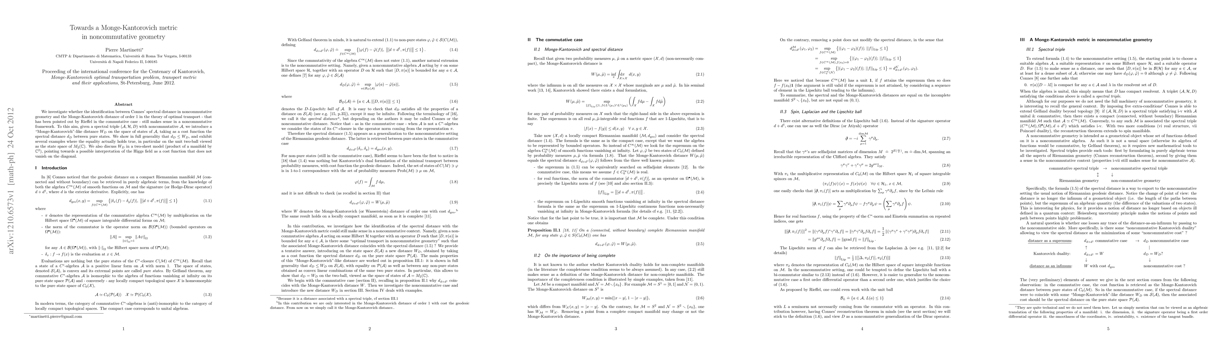This paper explores the potential identification of Connes' spectral distance in noncommutative geometry with the Monge-Kantorovich distance, showing that a "Monge-Kantorovich"-like distance W_D on the space of states satisfies d_D ≤ W_D, with equality in specific cases like the unit two-ball. The authors also examine W_D in a two-sheet model and suggest an interpretation of the Higgs field in this context.
