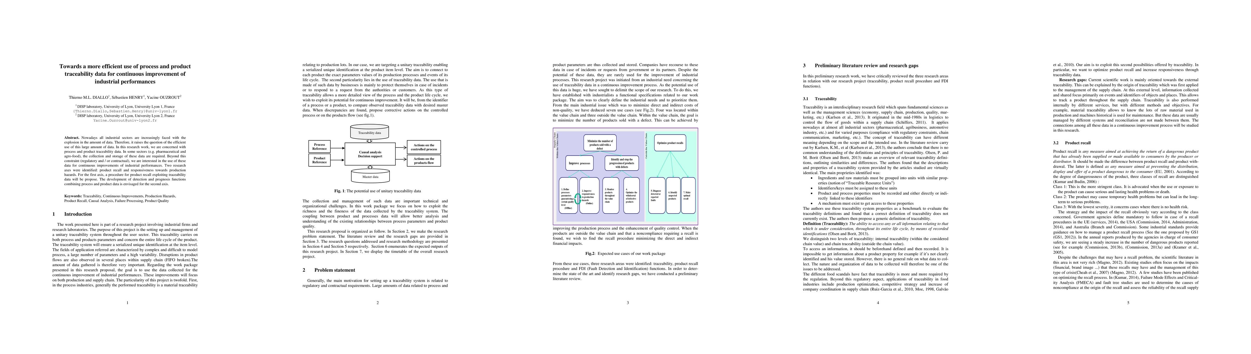 Nowadays all industrial sectors are increasingly faced with the explosion in the amount of data. Therefore, it raises the question of the efficient use of this large amount of data. In this research work, we are concerned with process and product traceability data. In some sectors (e.g. pharmaceutical and agro-food), the collection and storage of these data are required. Beyond this constraint (regulatory and / or contractual), we are interested in the use of these data for continuous improvements of industrial performances. Two research axes were identified: product recall and responsiveness towards production hazards. For the first axis, a procedure for product recall exploiting traceability data will be propose. The development of detection and prognosis functions combining process and product data is envisaged for the second axis.