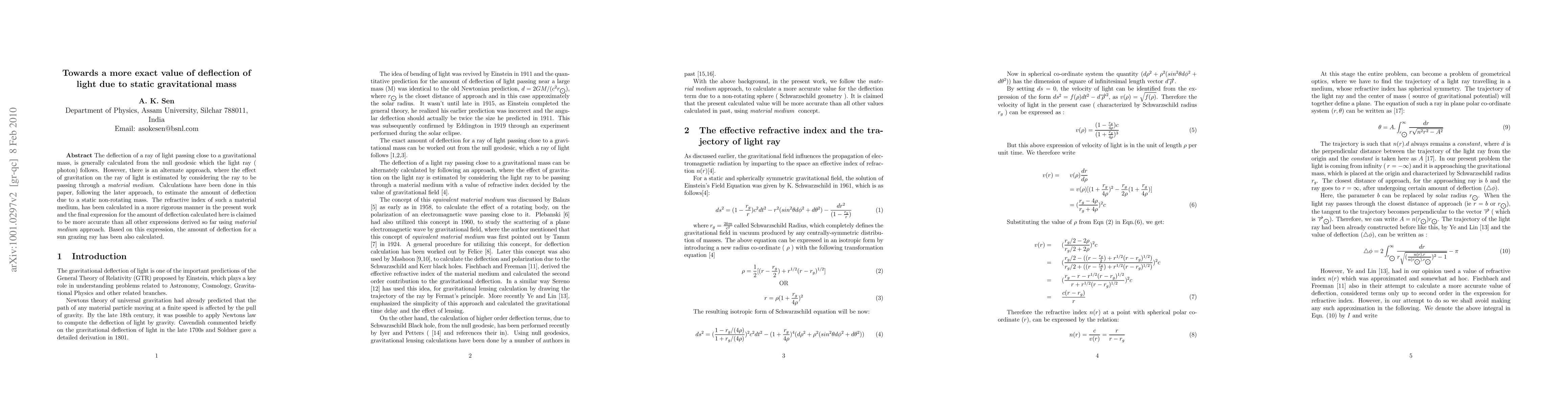 This paper proposes an alternative method to calculate the deflection of light by a static gravitational mass, treating light as passing through a material medium. The study claims to achieve a more precise refractive index calculation, resulting in a more accurate deflection value compared to previous methods.