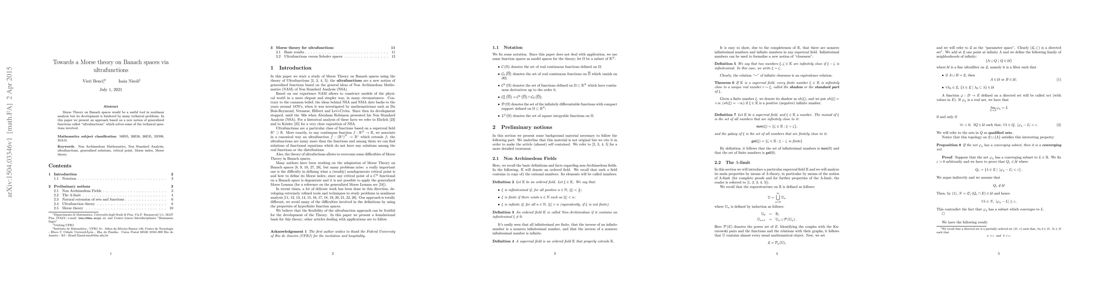 Morse Theory on Banach spaces would be a useful tool in nonlinear analysis but its development is hindered by many technical problems. In this paper we present an approach based on a new notion of generalized functions called \textquotedblleft ultrafunctions\textquotedblright\ which solves some of the technical questions involved.