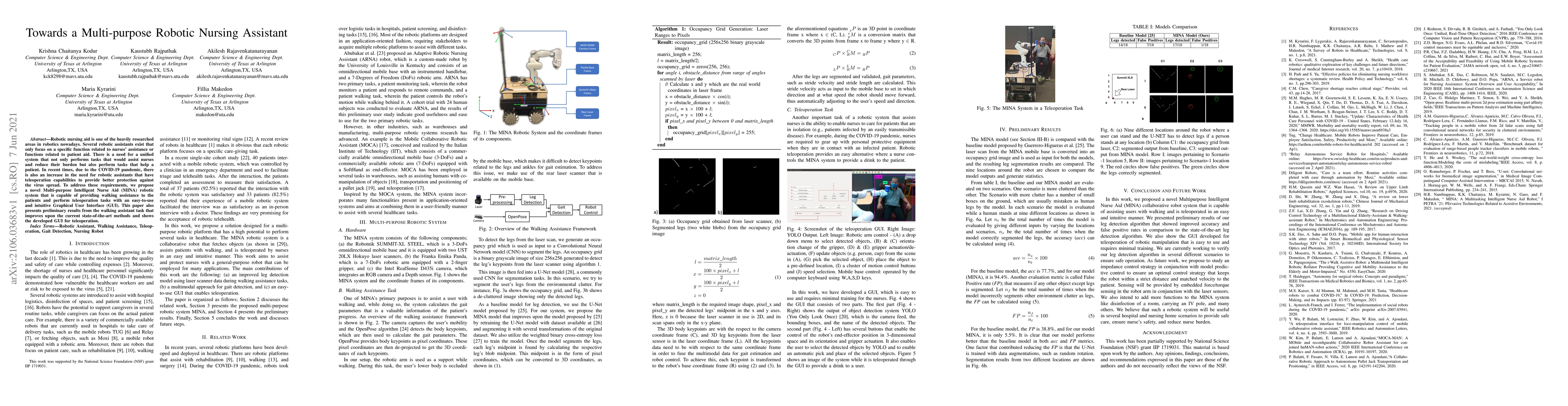 Robotic nursing aid is one of the heavily researched areas in robotics nowadays. Several robotic assistants exist that only focus on a specific function related to nurses assistance or functions related to patient aid. There is a need for a unified system that not only performs tasks that would assist nurses and reduce their burden but also perform tasks that help a patient. In recent times, due to the COVID-19 pandemic, there is also an increase in the need for robotic assistants that have teleoperation capabilities to provide better protection against the virus spread. To address these requirements, we propose a novel Multi-purpose Intelligent Nurse Aid (MINA) robotic system that is capable of providing walking assistance to the patients and perform teleoperation tasks with an easy-to-use and intuitive Graphical User Interface (GUI). This paper also presents preliminary results from the walking assistant task that improves upon the current state-of-the-art methods and shows the developed GUI for teleoperation.