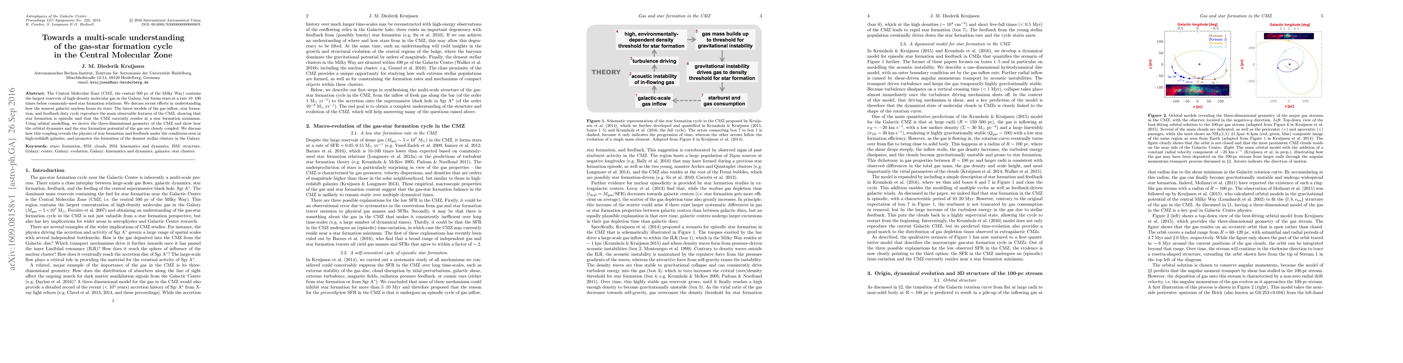 The Central Molecular Zone (CMZ, the central 500 pc of the Milky Way) contains the largest reservoir of high-density molecular gas in the Galaxy, but forms stars at a rate 10-100 times below commonly-used star formation relations. We discuss recent efforts in understanding how the nearest galactic nucleus forms its stars. The latest models of the gas inflow, star formation, and feedback duty cycle reproduce the main observable features of the CMZ, showing that star formation is episodic and that the CMZ currently resides at a star formation minimum. Using orbital modelling, we derive the three-dimensional geometry of the CMZ and show how the orbital dynamics and the star formation potential of the gas are closely coupled. We discuss how this coupling reveals the physics of star formation and feedback under the conditions seen in high-redshift galaxies, and promotes the formation of the densest stellar clusters in the Galaxy.
